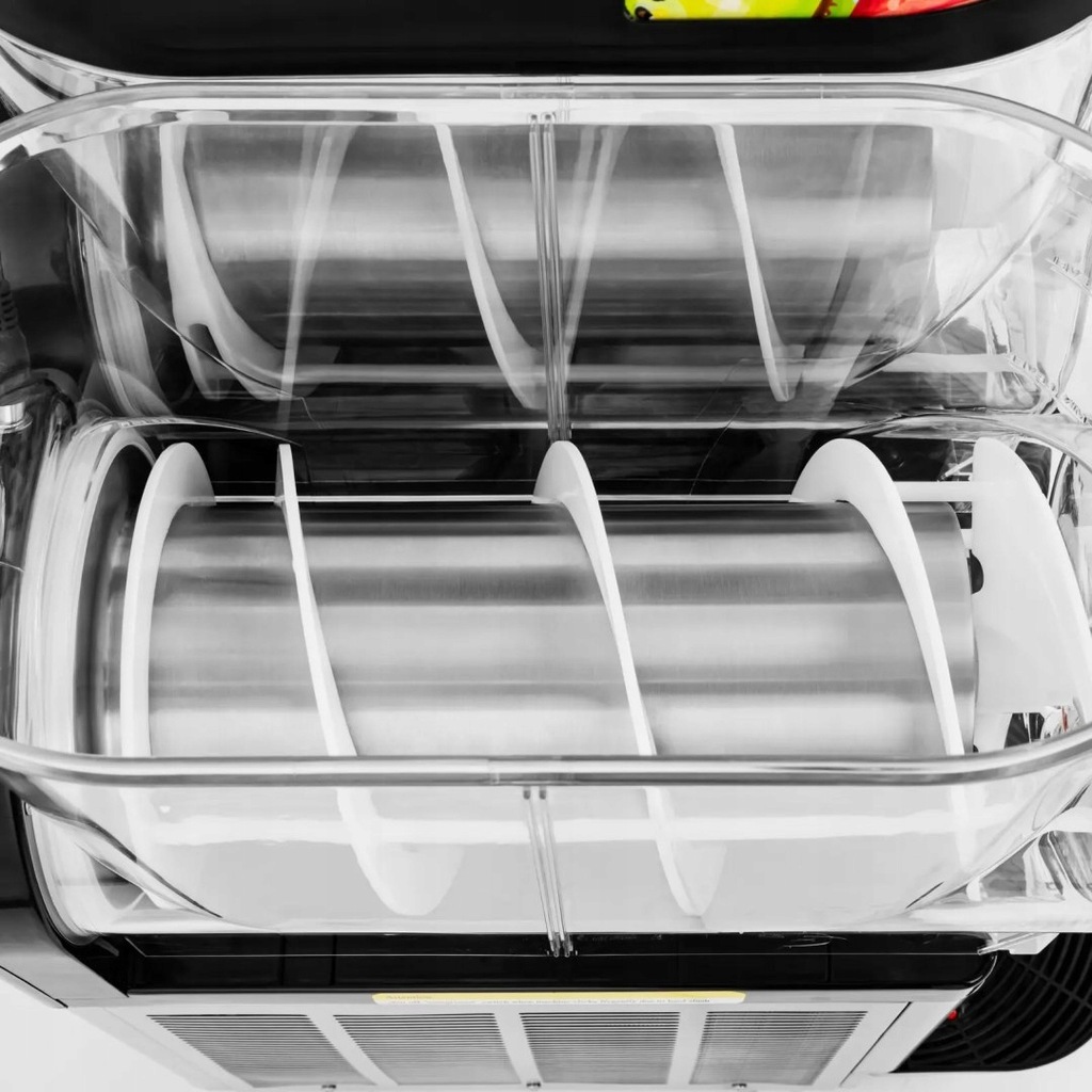 Granitor marki Royal Catering pozwala stworzyć w kawiarni lub barze kolorowe napoje bezalkoholowe, które atrakcyjnie prezentowane są z podświetleniem LED. Slushy to także orzeźwiająca atrakcja, która przyciąga wzrok na festynach, targowiskach czy na basenie. Maszyna pozwala również serwować wszelkiego rodzaju inne zimne napoje, takie jak napoje owocowe, koktajle, a nawet sorbety. Dzięki mocy 960 W i cyklowi pracy od 8 do 16 godzin maszyna zapewnia dużą ilość smacznego lodowego deseru. Energooszczędny czynnik chłodzący R290 dba o optymalną temperaturę w zakresie od -2 do 10°C, a mieszadło utrzymuje konsystencję bez grudek. Temperatura i funkcje ustawiane są na intuicyjnym, cyfrowym panelu sterowania z wyświetlaczem LED. Urządzenie posiada 3 pojemniki po 12 litrów każdy do produkcji granity, dzięki czemu można łączyć różne kolory i smaki w jednym urządzeniu. Aby zapewnić atrakcyjną prezentację, pojemniki są wykonane z przezroczystego tworzywa sztucznego niezawierającego BPA i podświetlane efektownymi diodami LED. Mieszadło utrzymuje mrożony napój w ruchu i w magiczny sposób przyciąga klientelę.Duże krany dozujące obsługuje się z łatwością. Tacki ociekowe utrzymają miejsce pracy w czystości. Pojemniki są zabezpieczone od góry pokrywą.