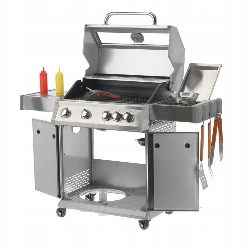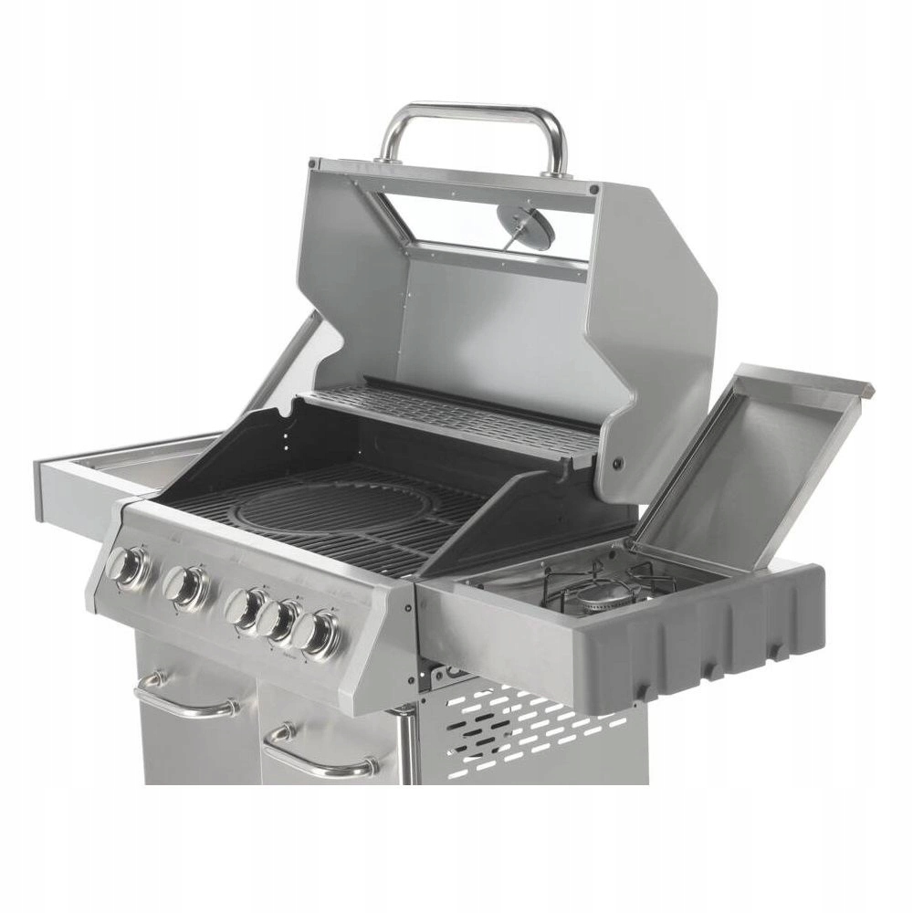 Zestaw 4+1 obejmuje 4 palniki główne ze stali nierdzewnej o mocy 3 kW każdy oraz 1 palnik boczny o mocy 2,2 kW, umożliwiający gotowanie i podgrzewanie potraw w garnku lub na patelni. Łączna moc wynosi 14,2 kW, przy średnim spalaniu gazu 1032 g/h. Średnica dyszy 4x0.8 + 1x0.7 mm. Praktyczność grillowania podkreślają półki boczne, pojemna szafka, osłona palnika (aromatyzer), stalowa misa odporna na wysoką temperaturę oraz obrotowe kółka z hamulcem ułatwiające transport. Dodatkowe udogodnienia to 6 wieszaków na półkach bocznych, 5 pokręteł z niebieskim światłem LED informujących o włączonych palnikach, otwieracz do butelek z boku grilla oraz możliwość wysunięcia płyty ściekowej i umycia jej poza grillem.