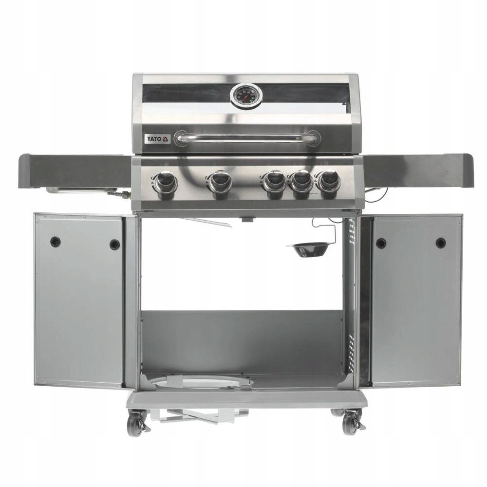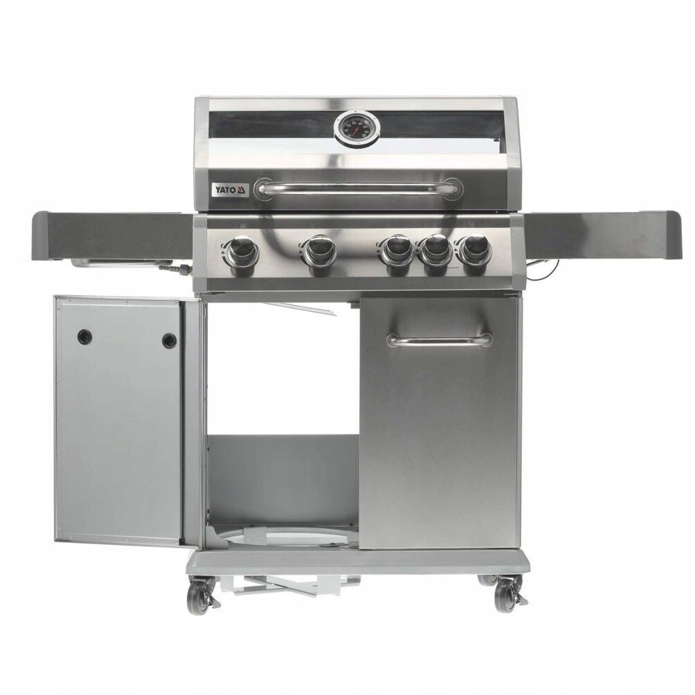 Grill Gazowy 4+1 marki YATO o wymiarach 133x57x112 cm wykonany z wysokiej jakości stali nierdzewnej. Centralnym elementem grilla jest szybko nagrzewalny żebrowy ruszt żeliwny o wymiarach 70x41,5 cm - 3 ruszty: 22,5x41,5 cm (2szt), 22x41,5cm (1szt), który długo utrzymuje ciepło. Dodatkowo, grill posiada wyjmowany okrągły ruszt o średnicy 30 cm, wbudowany w główny ruszt. Ten element można z łatwością zastąpić kamieniem do pizzy (brak w zestawie), co pozwala na rozszerzenie możliwości grilla. Wygoda użytkowania to także zasługa półek bocznych oraz pojemnej, zamykanej szafki, które ułatwiają przechowywanie niezbędnych akcesoriów, przypraw i innego wyposażenia. Dodatkowy palnik boczny o mocy 2,2 kW otwiera nowe możliwości, umożliwiając gotowanie i podgrzewanie potraw w garnku lub na patelni. Atutem jest miejsce na polską butlę gazową 11l, pojemnik ze stali nierdzewnej umieszczony w jednej z półek bocznych oraz wbudowany otwieracz do butelek.