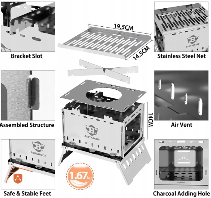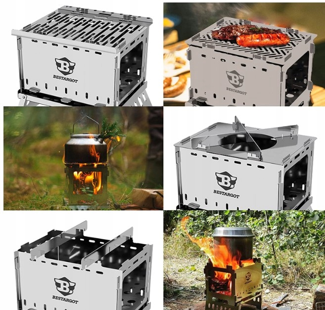 - 【Wszechstronny design】Bestargot posiada patent na projekt tej kuchenki hobo z piecem na drewno. Jako grill, hobo, piec na drewno lub jako „grill hobo”. Nowo zaprojektowany pogrubiony górny ruszt do gotowania, bardziej wytrzymały i stabilny. Po obu stronach znajduje się zagięcie, które zapobiega staczaniu się kiełbasy.Kempingowy piec na drewno Bestargot jest niewielkich rozmiarów, ale ma dużą moc gotowania, skupia płomienie i podgrzewa je na garnku lub kubku.