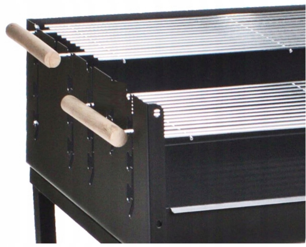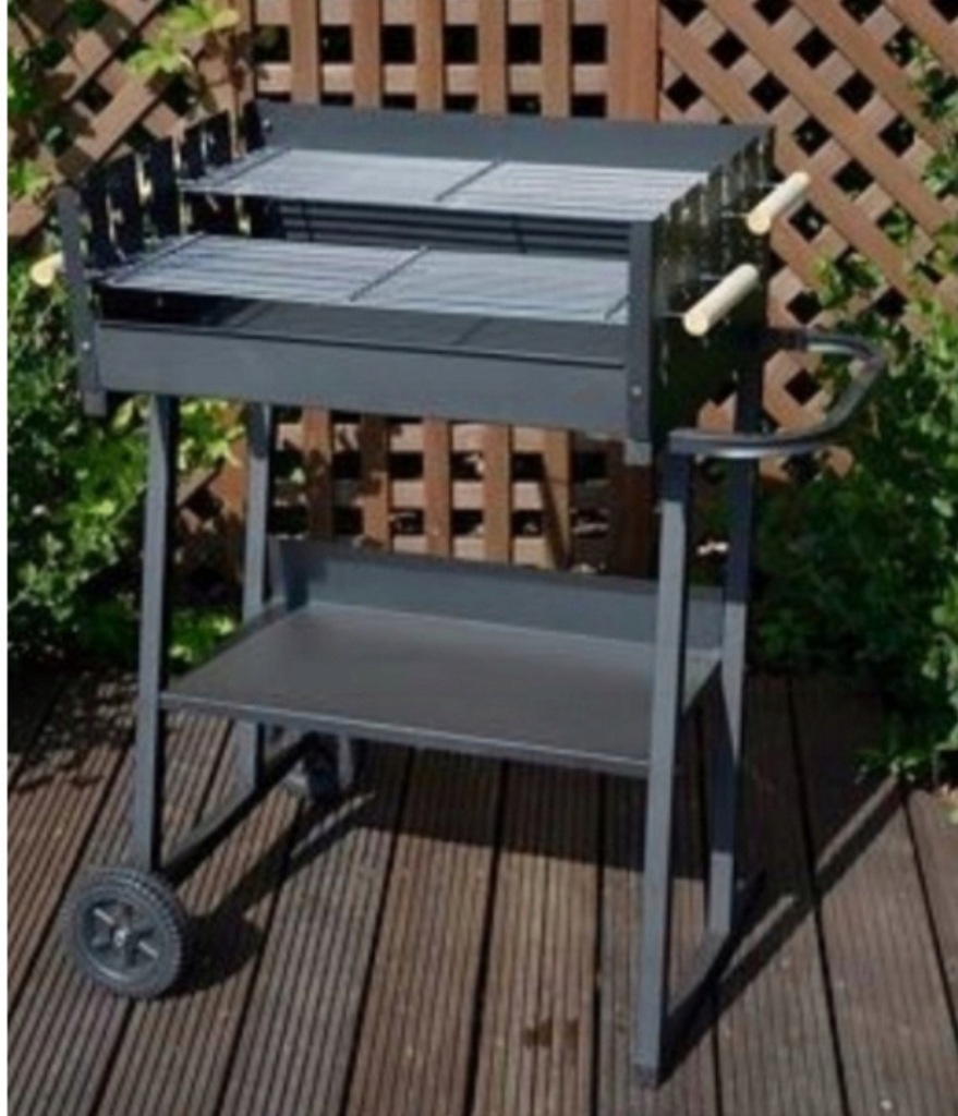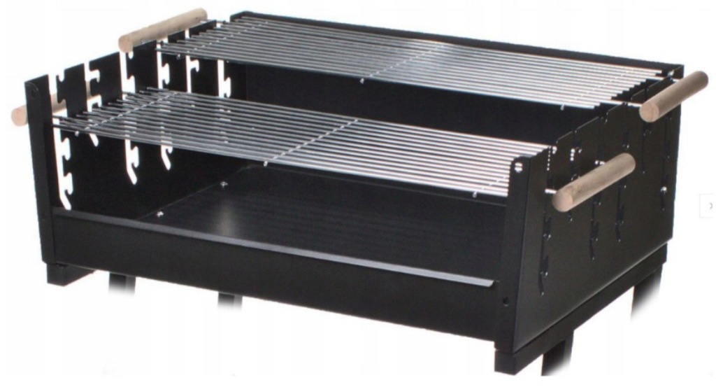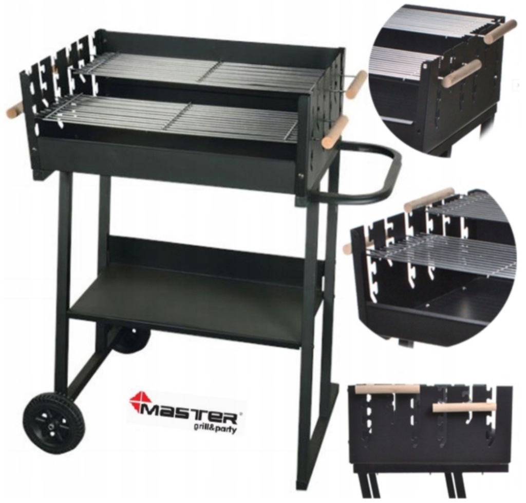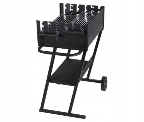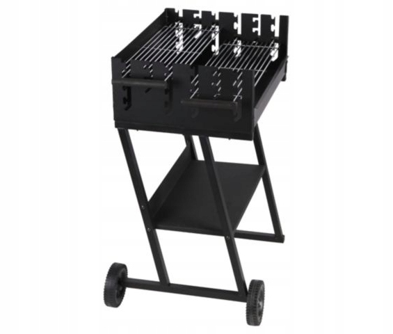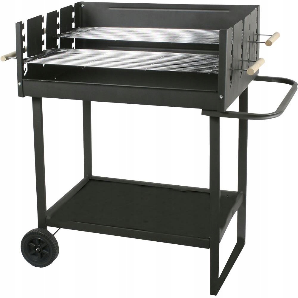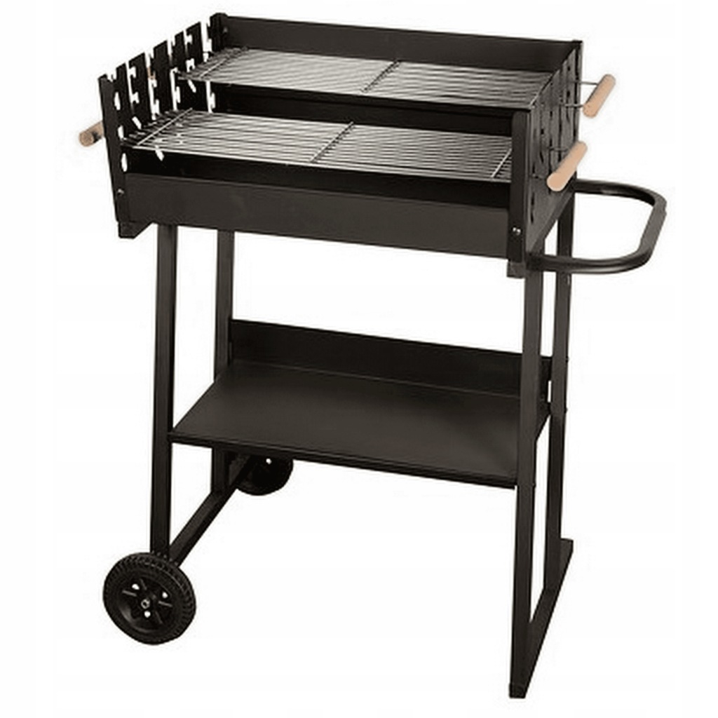 Grill prostokątny, wymiary 59,5 x 44,5 cm, wys. 89 cm, misa i owiewka wykonane ze stali pokrytej farba żaroodporną, wyposażony w 2 chromowane ruszty z drewnianymi uchwytami, możliwość jednoczesnego grillowania na 2 różnych poziomach rusztu lub grillowanie na 1 ruszcie podczas gdy drugi ruszt może służyć jako podgrzewacz, grill wyposażony w kółka transportowe i dolną półkę, wymiary rusztu: 58,5 x 20,5 cm