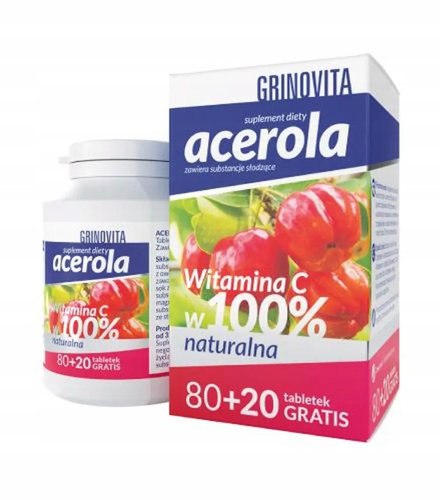 Grinovita Acerola to suplement diety w postaci tabletek do ssania odpowiedni jako uzupełnienie codziennej diety osób. Sprawdzi się także do stosowania u dzieci od 3 roku życia. Składnikiem aktywnym produktu jest ekstrakt z owoców aceroli naturalnie bogaty w witaminę C.