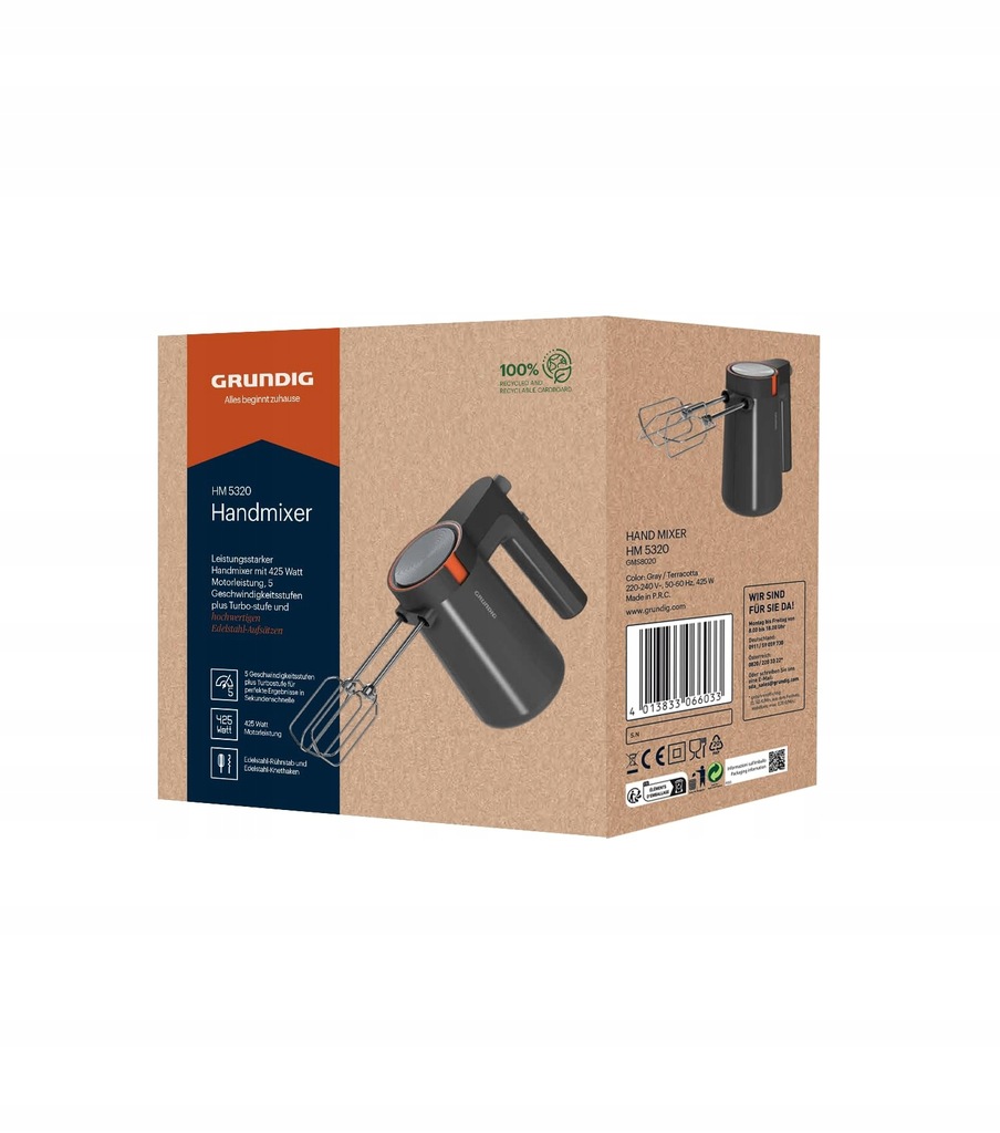 - nazwa przedmiotu: Grundig HM 5320 mikser ręczny, moc 425 W, 5 stopni prędkości + poziom turbo, wysokiej jakości nasadki ze stali nierdzewnej, akcesoria nadające się do mycia w zmywarce, kolor szary/terakota