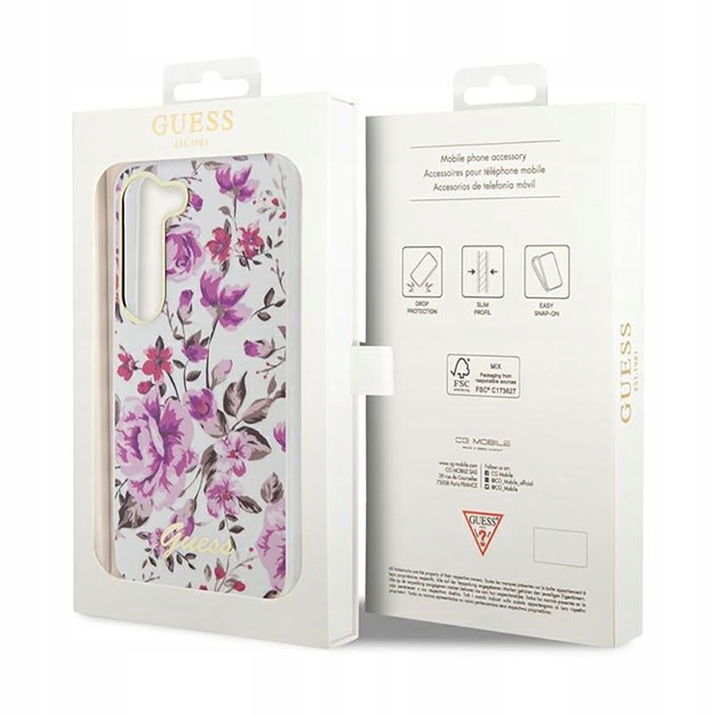 Guess Flower Collection etui wykonane z wytrzymałego TPU. Zapewnia telefonowi najlepszą ochronę przed zadrapaniami, wstrząsami, kurzem i ewentualnymi upadkami. Konstrukcja ozdobiona została motywem kwiatowym. Na dole znajduje się duże logo Guess.