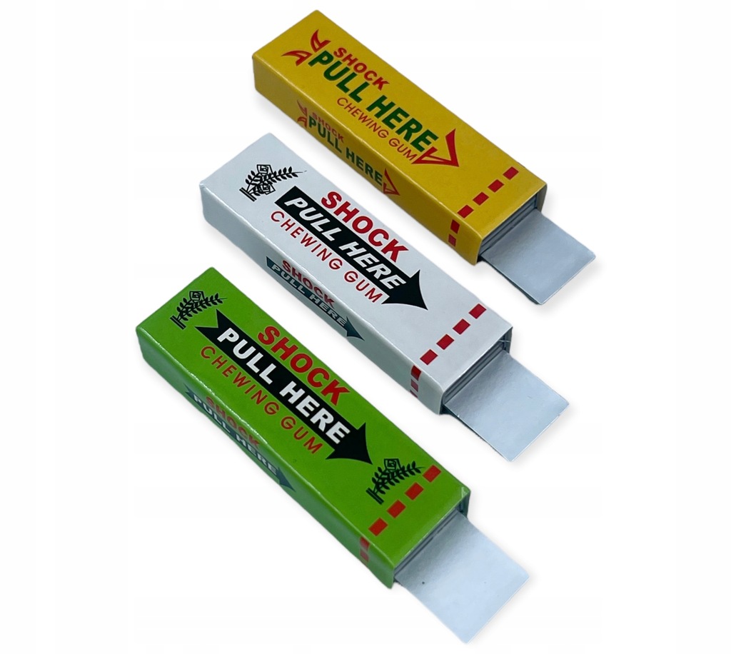 Opakowanie zabawki łudząco przypomina paczkę gum do żucia.Kiedy pociąga się za wysunięty listek zostajemy porażeni prądem.Ty jako jego właściciel możesz bezpiecznie go używać bo znasz jego tajemnicę.