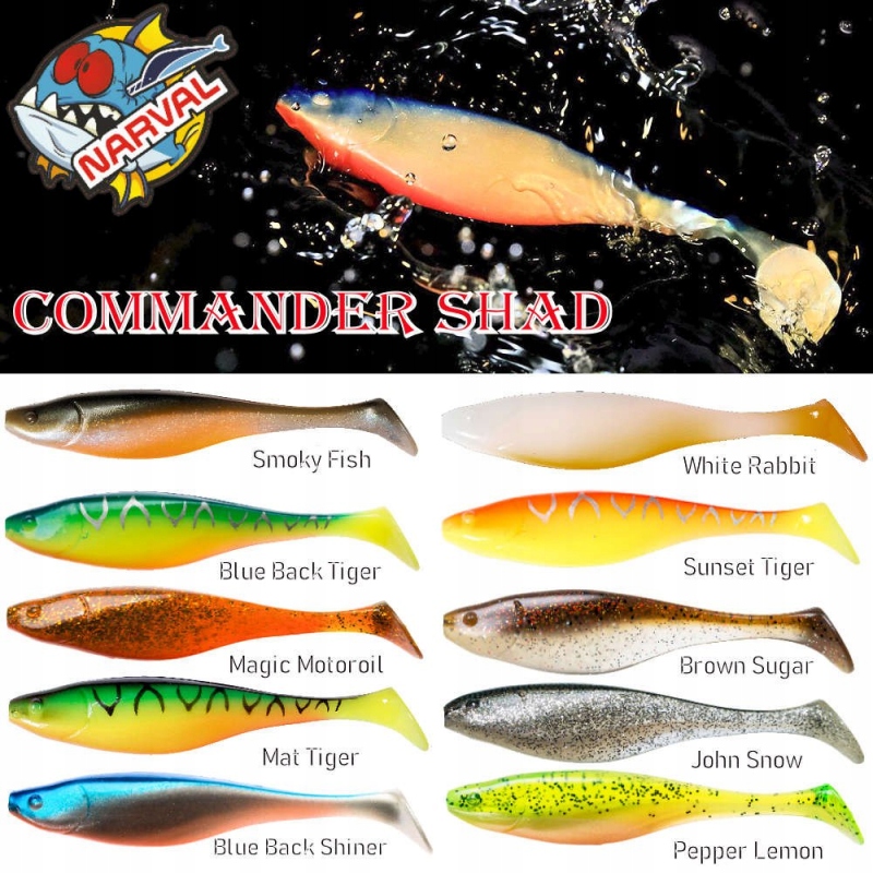 COMMANDER SHAD - specjalista od trofeów!!!Klasyczna przynęta, ale z wieloma specjalnymi cechami. Silikon użyty do produkcji przynęty jest bardzo miękki, ale jednocześnie bardzo odporny na ostre zęby drapieżnika.Przednia część brzucha przynęty ma rodzaj „podkładki”, która sprawia, że przynęta toczy się na boki i wzmacnia emitowane przez nią wibracje. Średniej wielkości ogon nie tylko wibruje na boki podczas zwijania, ale jednocześnie zamyka się wokół własnej osi, tworząc dodatkowe turbulentne wibracje.Rozmiar przynęty - 10 cmWaga przynęty - 9grIlość w opakowaniu - 5 sztuk