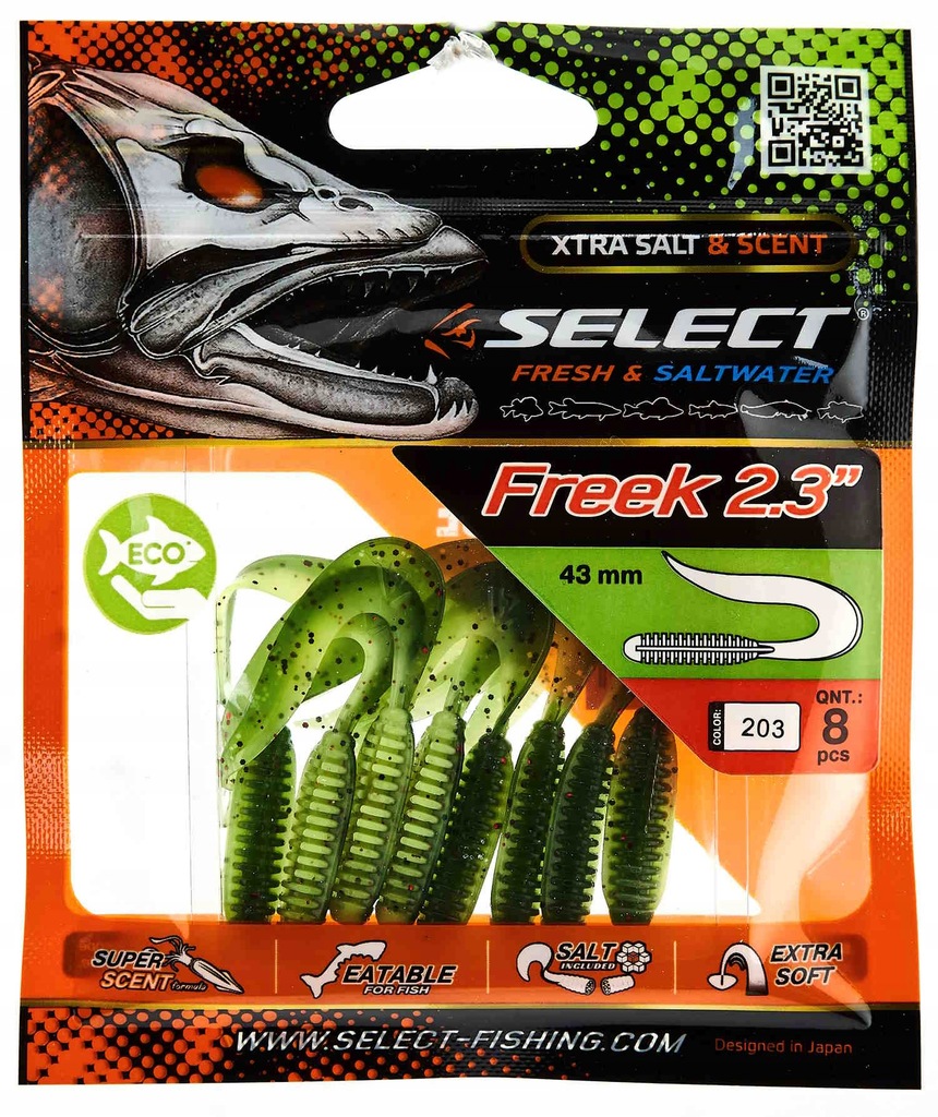 Twister o prążkowanym korpusie i długim, obszernym ogonie. Optymalnie dobrany kształt i grubość ogona sprawiają, że Freek zawsze pozostaje w ruchu, zarówno w bardzo powolnym opadzie jak i podczas agresywnego prowadzenia. Freek jest wyjątkowo wszechstronny i potrafi sprowokować wszystkie gatunki ryb, które lubią atakować miękkie przynęty. Opcje zbrojenia zależą wyłącznie od warunków panujących na łowisku - może to być standardowa główka jigowa, hak offsetowy, podwójna kotwica lub wkręt z dozbrojką.