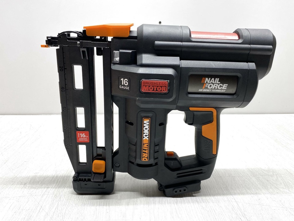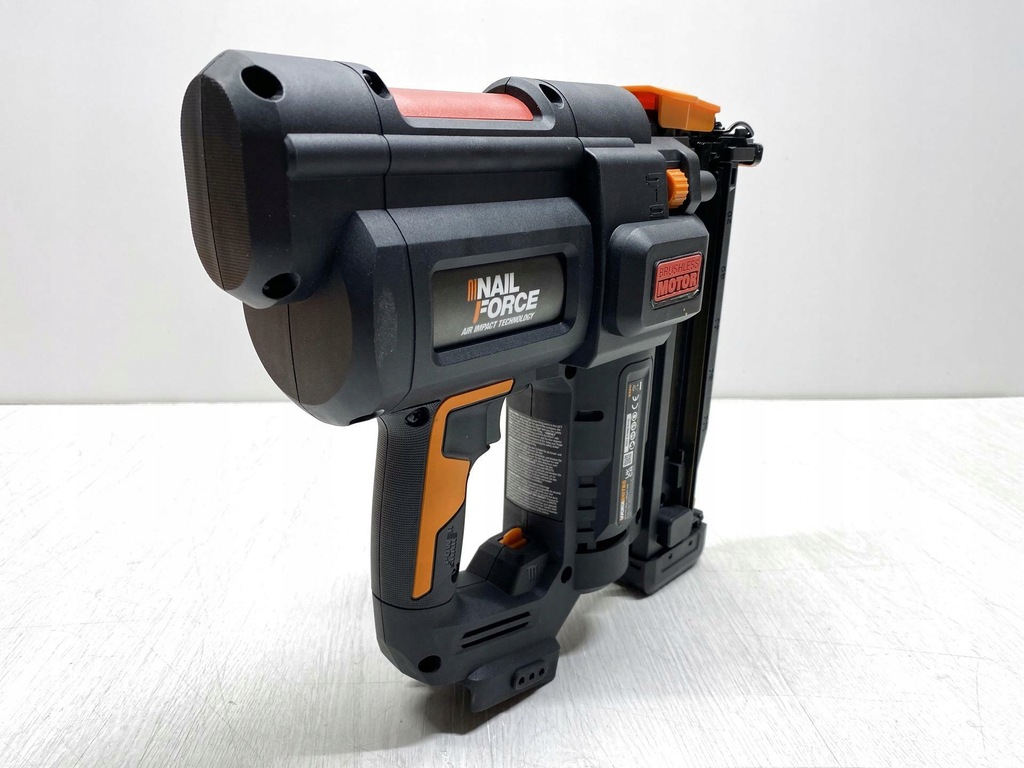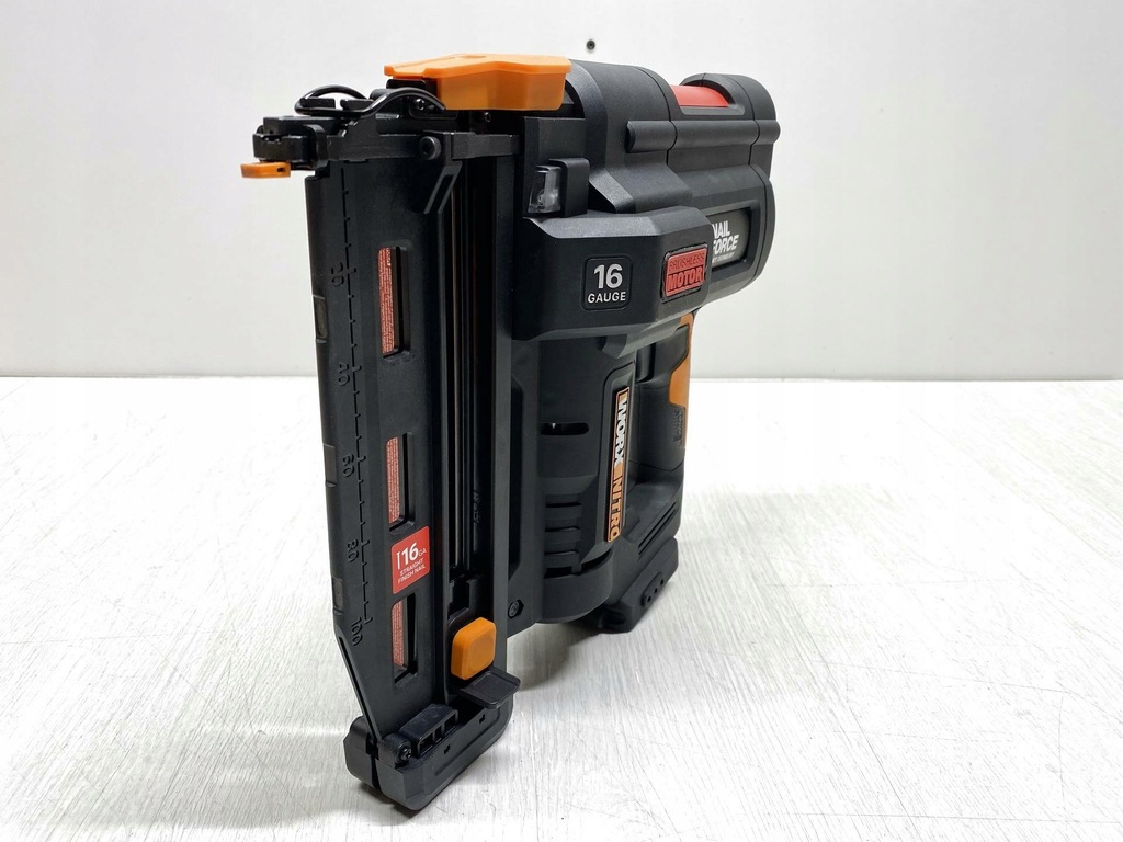Gwoździarka Worx o wydajności do 70 gwoździ na minutę. Idealnie nadaje się do mocowania listew przypodłogowych, paneli drzwiowych, listew ozdobnych i wielu innych. Pojemność magazynka to 105 gwoździ o maksymalnej długości 64 mm. Jest przeznaczona do gwoździ stożkowych o grubości 16 i szerokości 19-64 mm. Posiada wskaźnik informujący o niskim poziomie gwoździ w zapasie. Gwoździarka posiada 2 tryby pracy: „aktywacja kontaktowa” (gwóźdź wbijany jest po dotknięciu drewna) oraz „sekwencyjny” (gwóźdź wbijany jest po naciśnięciu przycisku).