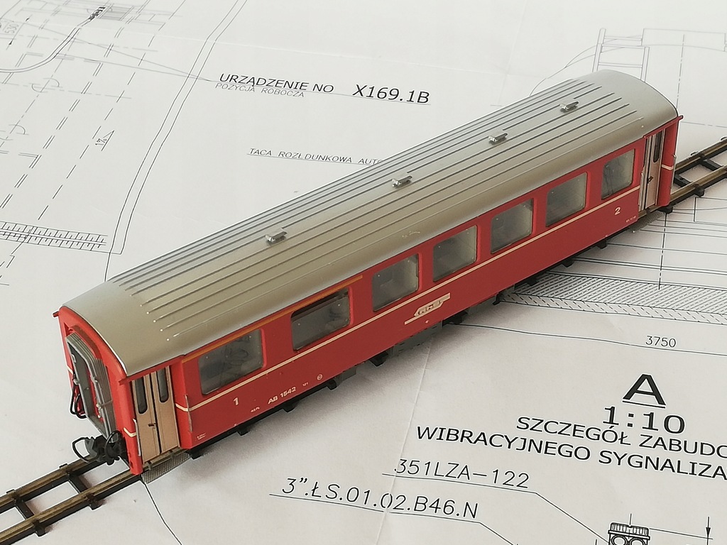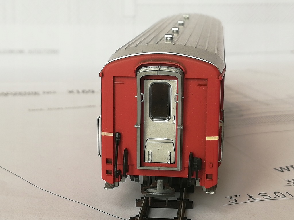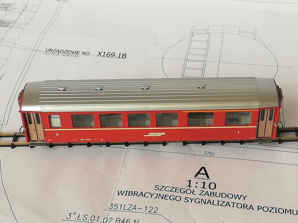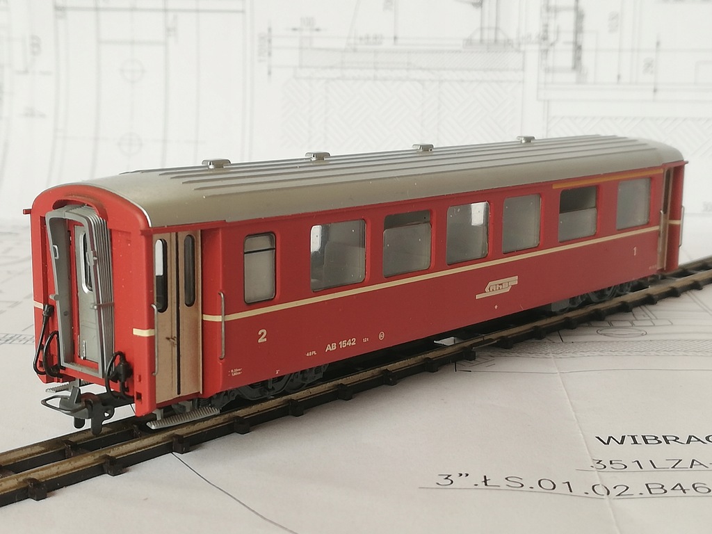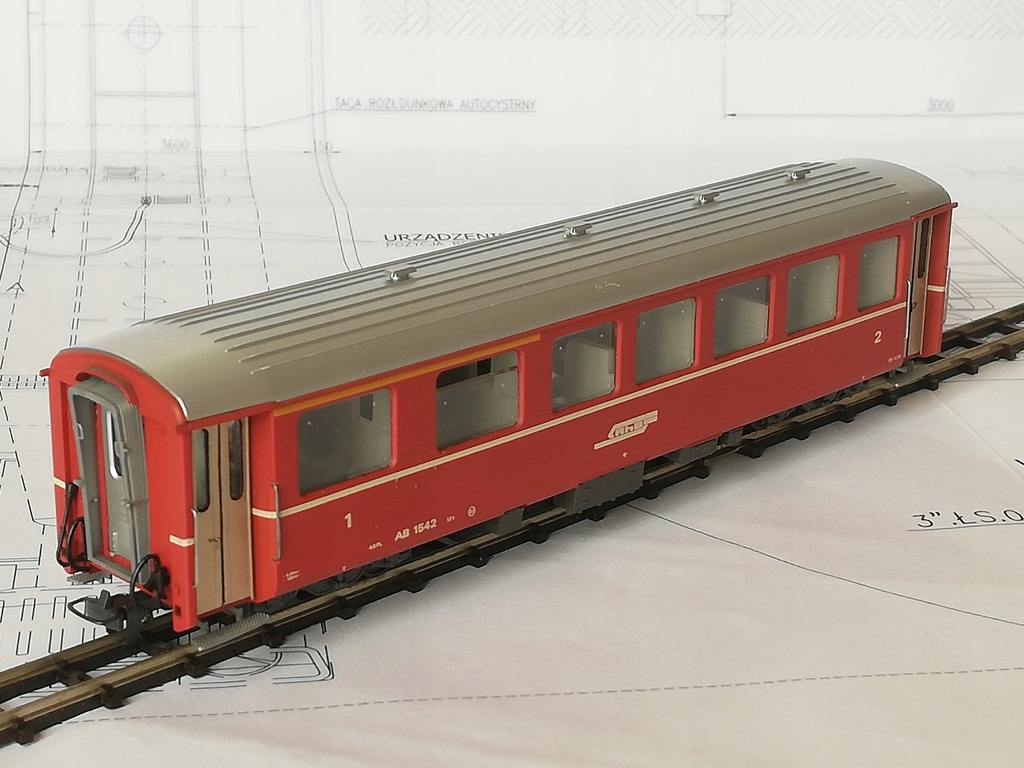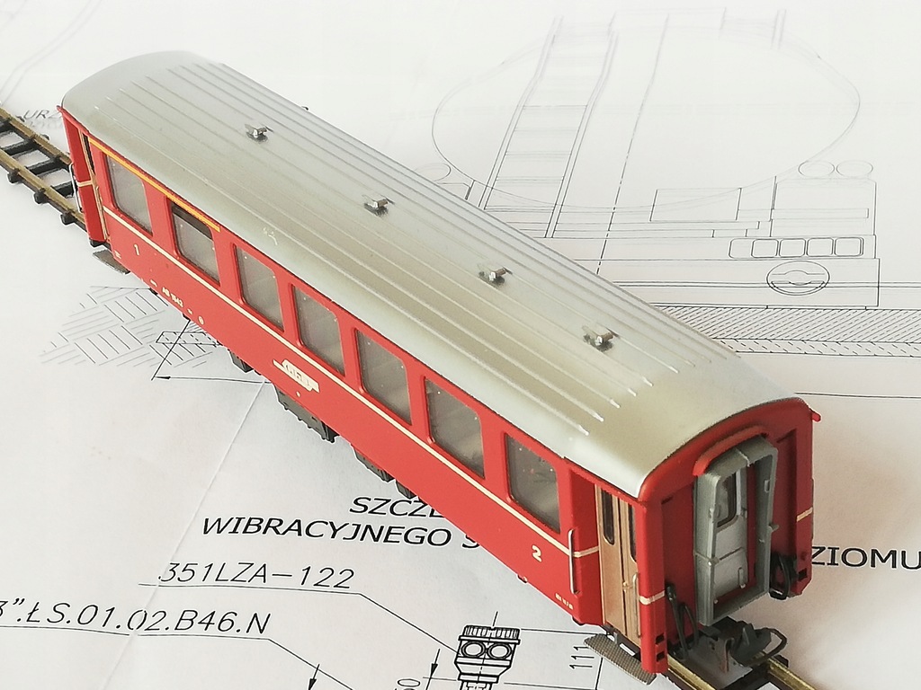 ...czteroosiowy wagon osobowy 1/2 klasy RHB skala H0e (1:87 / 9mm) / H0em (1:87 / 12mm). Model firmy Bemo. Model używany, stan bardzo dobry. Drobne ślady używania. Zamontowane dodatkowe elementy do samodzielnego montażu. Sprzęgi kompletne, koła metalowe czyste. Opakowanie dorobione do bezpiecznego transportu. Na życzenie mogę wymienić na osie o rozstawie kół 12mm (H0m).