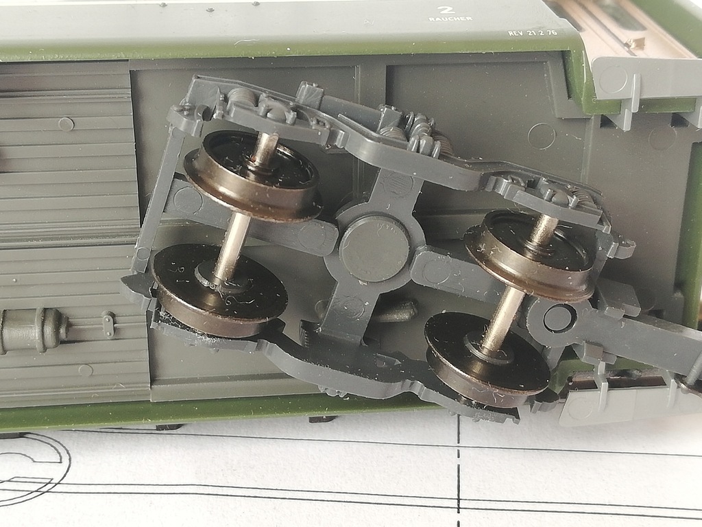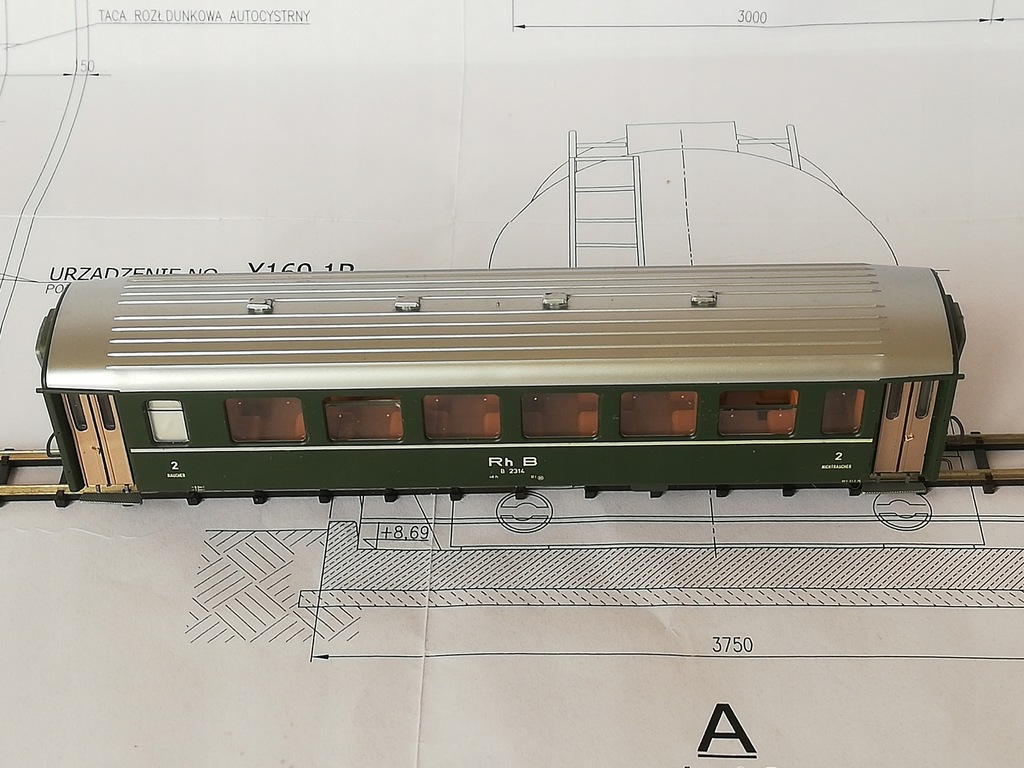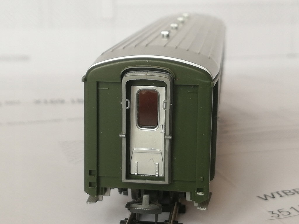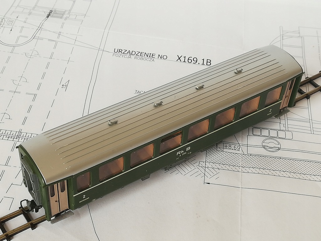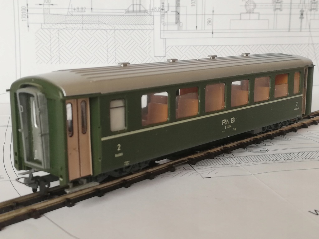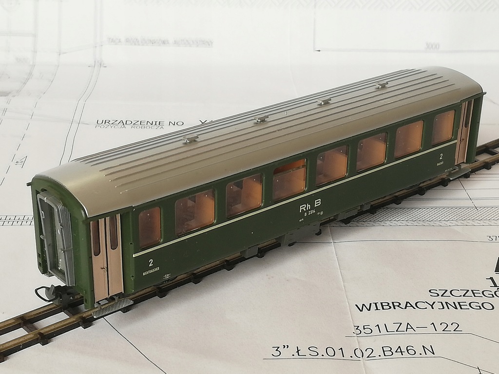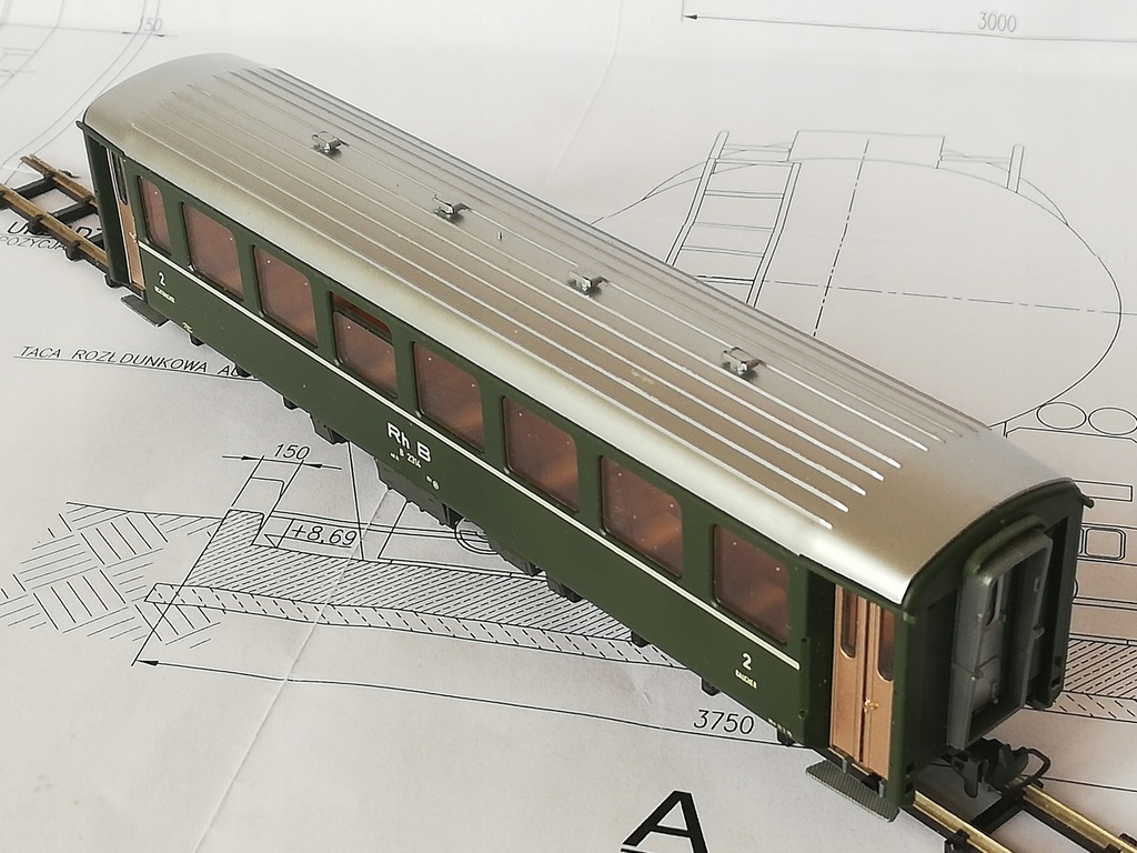 ...czteroosiowy wagon osobowy 2 klasy Rh.B, skala H0e (1:87 / 9mm)/.H0m (1:87 /12mm) Model firmy Bemo. Model używany, stan bardzo dobry. Drobne ślady używania. Brak dodatkowych elementów do samodzielnego montażu. Sprzęgi kompletne, koła metalowe czyste. Opakowanie dorobione do bezpiecznego transportu. Na życzenie mogę wymienić na osie o rozstawie kół 12mm (H0m).