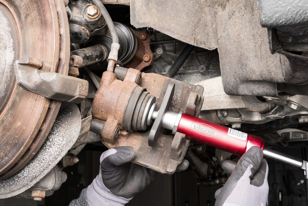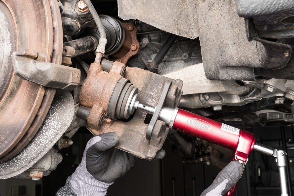 Uniwersalny i wydajny zestaw narzędzi VIGOR to idealne rozwiązanie do obracania, dociskania i resetowania tłoków hamulcowych prawie we wszystkich samochodach osobowych. Dzięki pneumatycznemu wyciskaczowi tłoczków hamulcowych praca jest nieszkodliwa i wydajna. Zestaw zawiera wrzeciono pneumatyczne oraz 22 płyty adapterowe, dzięki czemu jest odpowiedni do tłoków hamulcowych prawo- i lewoskrętnych. Waga opakowania wynosi 3,58 kg, a wymiary to 8,6 dł. x 34,8 wys. x 30,2 W (cm).