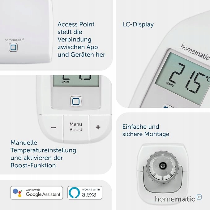 - Prosta i intuicyjna konfiguracja: pobierz aplikację, podłącz Homematic IP Access Point do routera, zeskanuj kody QR, przypisz urządzenia w aplikacji do pomieszczenia i w razie potrzeby dostosuj profil grzewczy – to po prostu inteligentne!