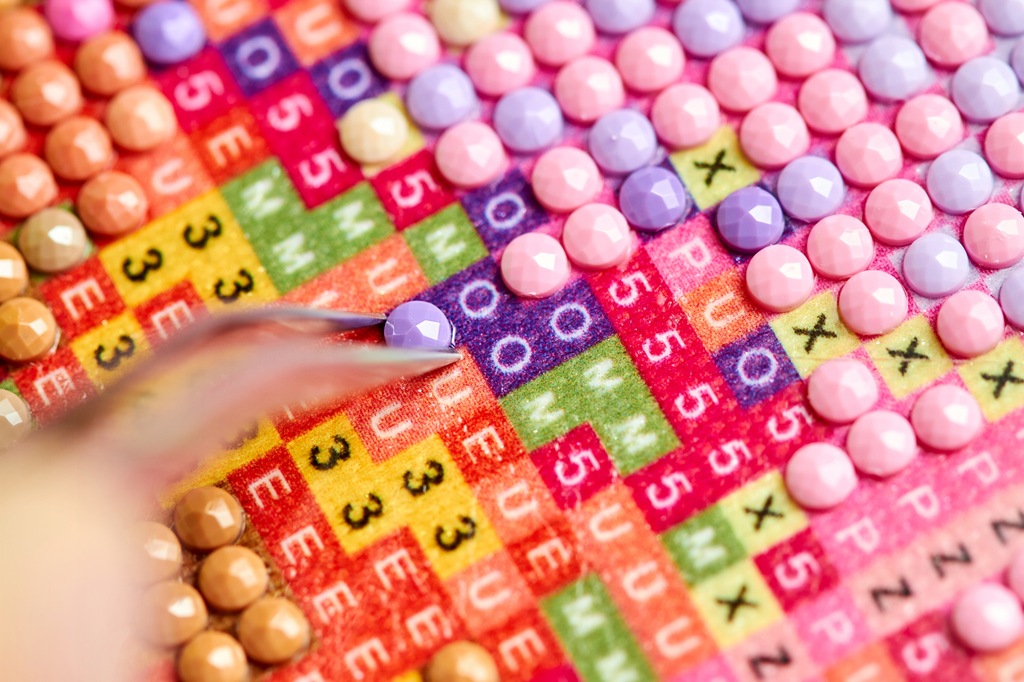 3. Wybierz diamenciki, które będziesz wyklejać. Znajdź na odkrytej części płótna odpowiednie symbole i numery. Wsyp do plastikowego pojemnika porcję wybranego koloru kryształków.