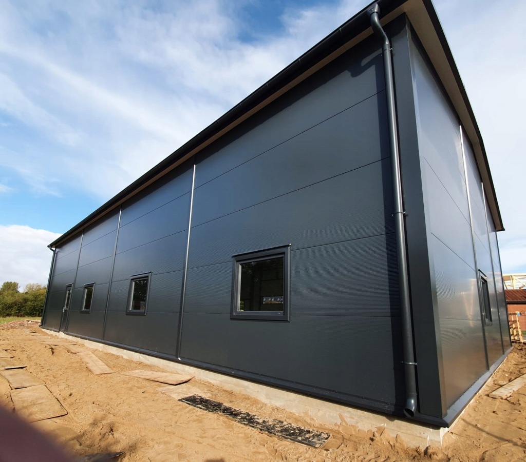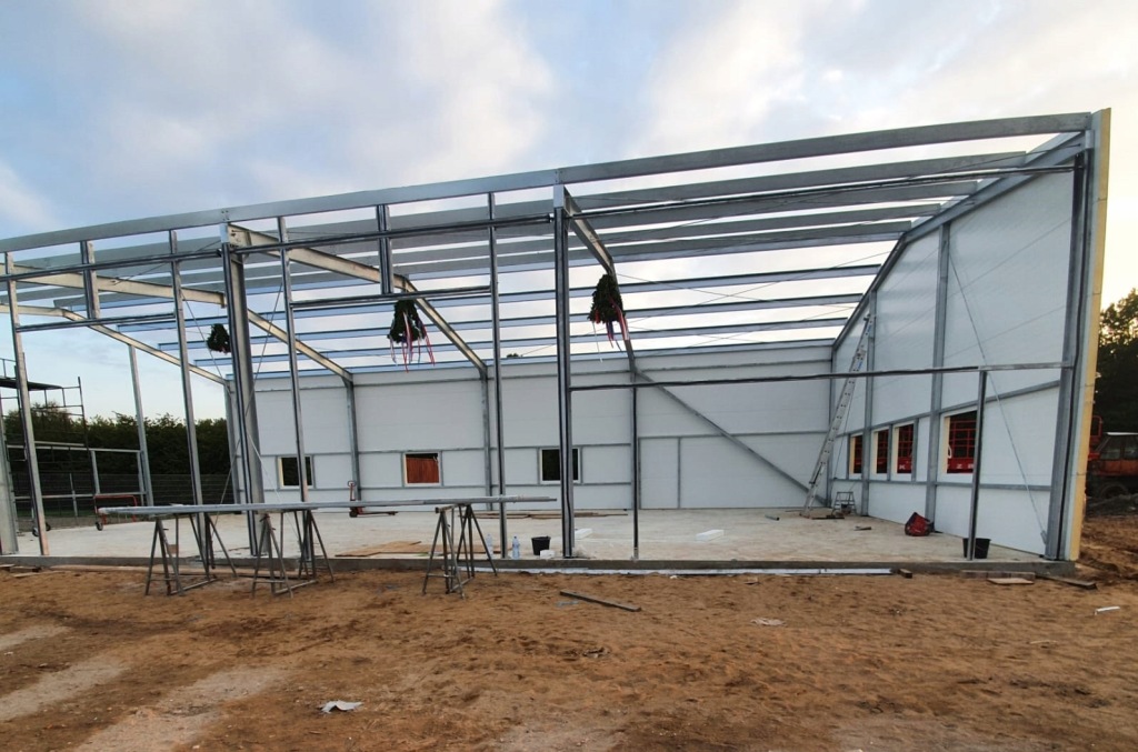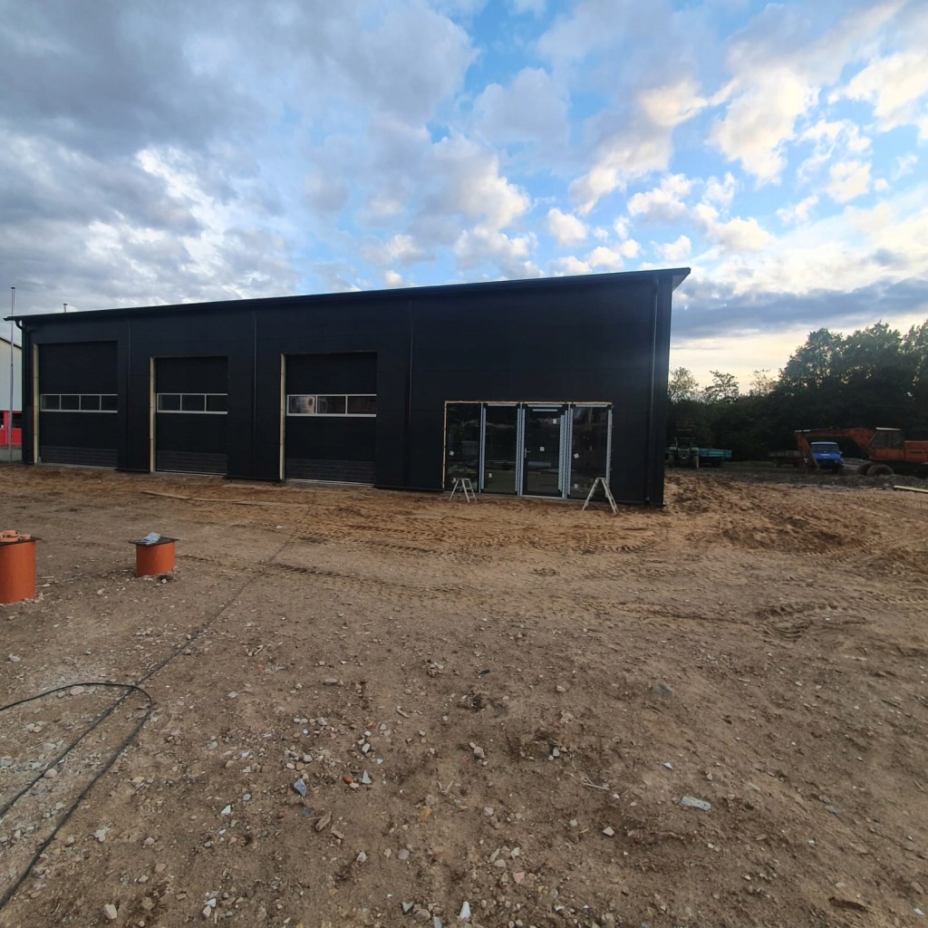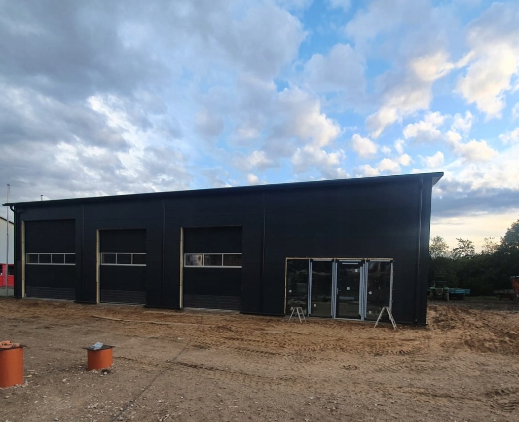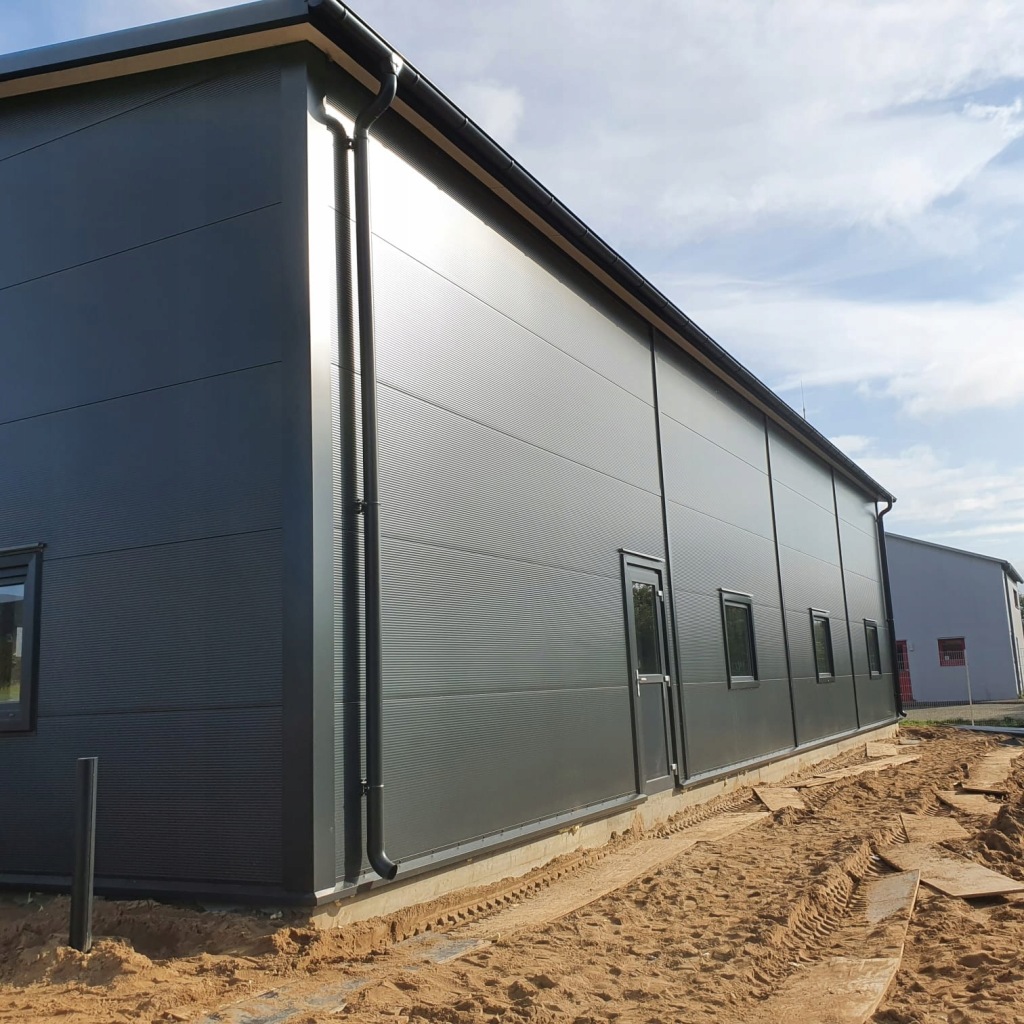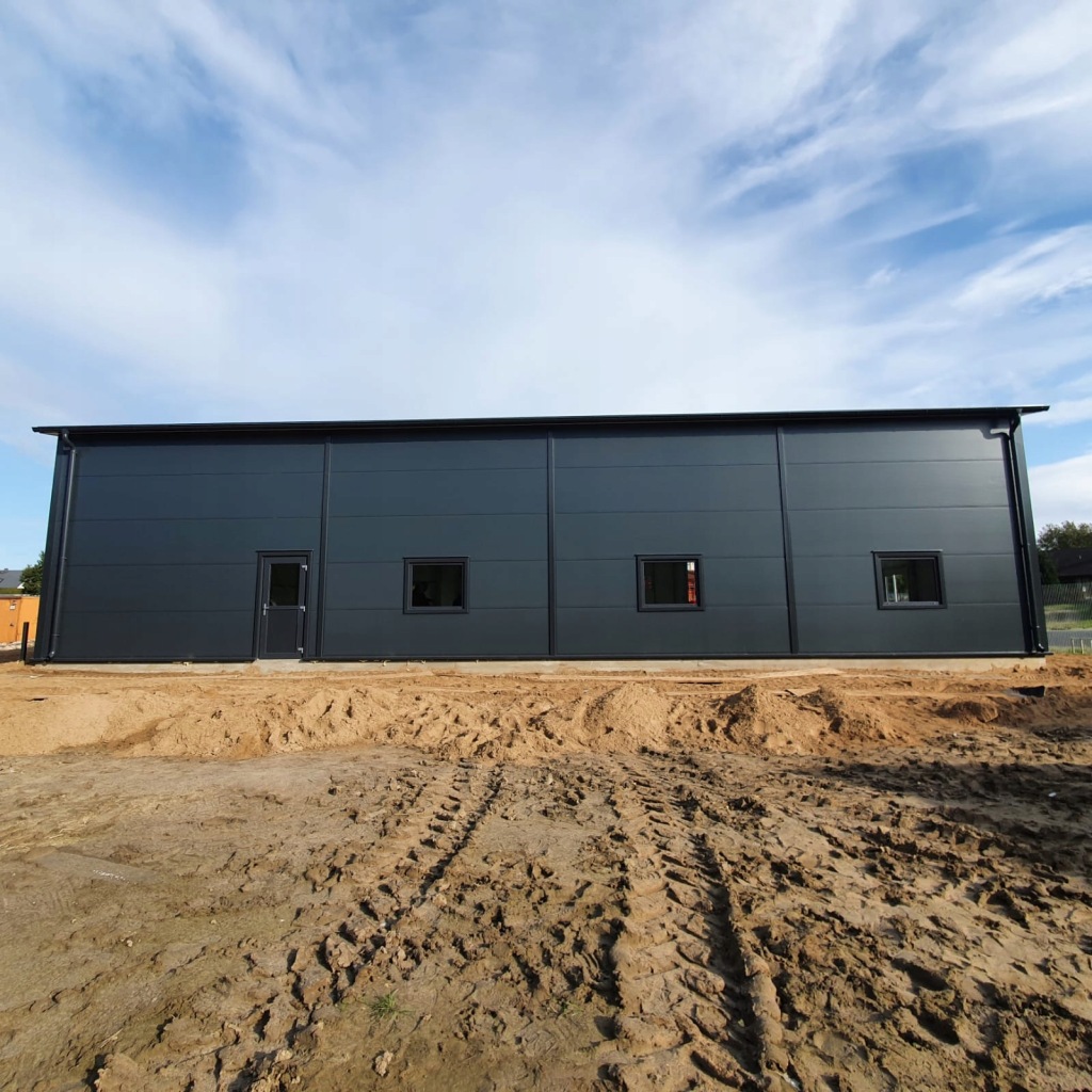 Hala 252m2 stalowa produkcyjna wykonana na konstrukcji nośnej z dwuteowników stalowych IPE, profili zamkniętych zimno giętych i zetowników.