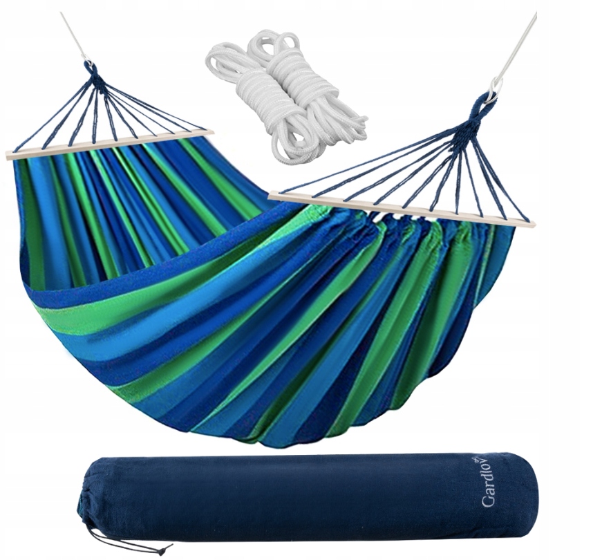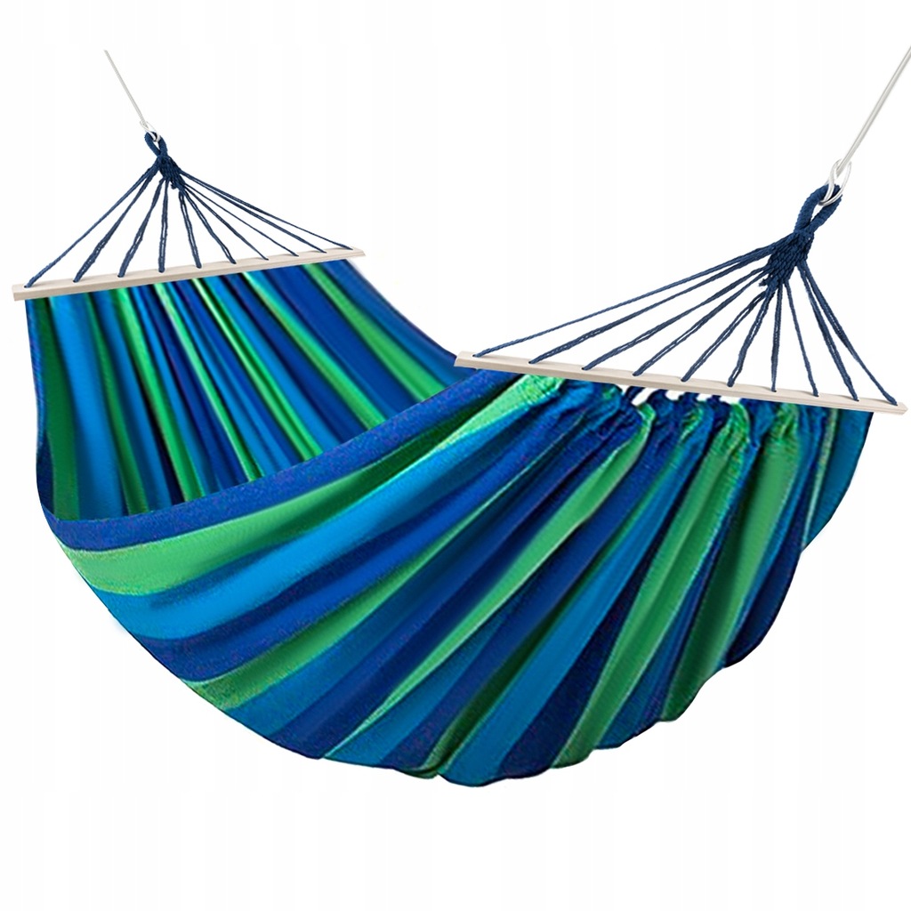 - SPECYFIKACJA - kolor: niebiesko/zielony; materiał: bawełna + poliester, pozostałe: drewno + nylon + pokrowiec: materiał: bawełna + poliester, pozostałe: nylon; maksymalne obciążenie: 150 kg; długość stelaża drewnianego: 82 cm; wymiary materiału (dł/szer) 180x160cm; wymiary całości (dł/szer): 260x160cm; waga:1,788 kg, waga w opakowaniu: 1,804 kg.