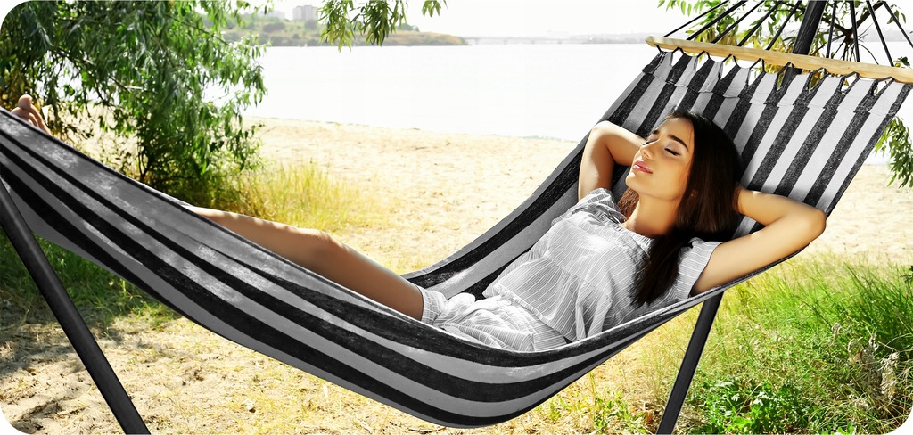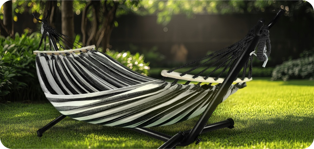To kompletny zestaw zapewniający maksymalną wygodę i swobodę użytkowania – korzystaj ze stelaża w ogrodzie lub zabierz sam hamak w podróż i ciesz się relaksem w dowolnym miejscu.