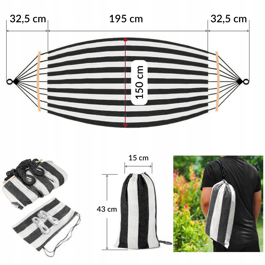 - 1x hamak z drewnianym pałąkiem w kolorze czarno-białym