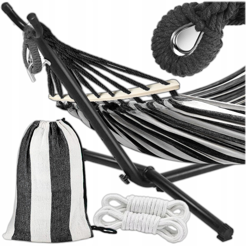 - Praktyczny zestaw – hamak zawiera metalowe "łezki" w uchwytach, worek do przechowywania, mocne linki montażowe oraz stelaż, dzięki czemu jest gotowy do użytku od razu po rozpakowaniu.
