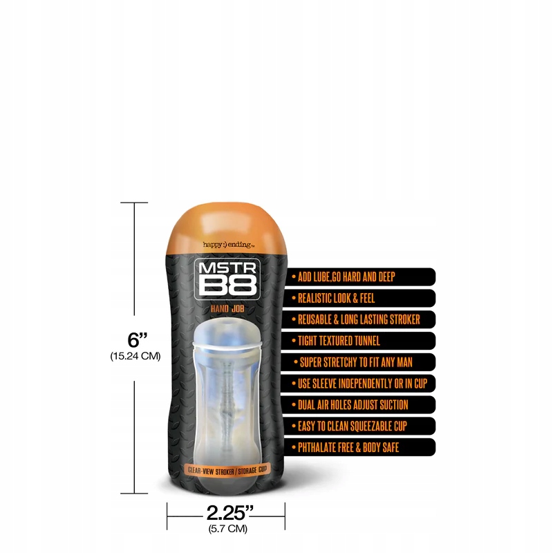 See all the action with the MSTRB8 In The Clear Handjob stroker. The reusable stroker with a tight and textured tunnel in the canister is wonderful for a mindblowing handjob experience. Translucent masturbator and canisterReusable and long lasting strokerLifelike and ultra soft openingTextured tunnel Super stretchy to fit any sizeUse the sleeve alone or in the canisterWith end cap to adjust the suctionScrew on top for storageFully disassembles for cleaningEasy to clean open ended sleeveNo slip, ringed grip canisterPhthalate free and body safeLength 10 inch / 25 cmWidth 3.75 inch / 9,5 cm