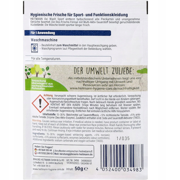 Ponadto zadbano o to, aby możliwe było zaimpregnowanie, pory nie zatykają się ubrania i zachowana jest funkcjonalna elastyczność odzieży. Czyszczenie nie było tak proste i nieskomplikowane. Heitmann oxiwash Sport łatwo i skutecznie usuwa plamy i nieprzyjemne zapachy z odzieży. Wieloaktywny tlenek uwalnia pary i daje odczuwalnie dłuższą świeżość.