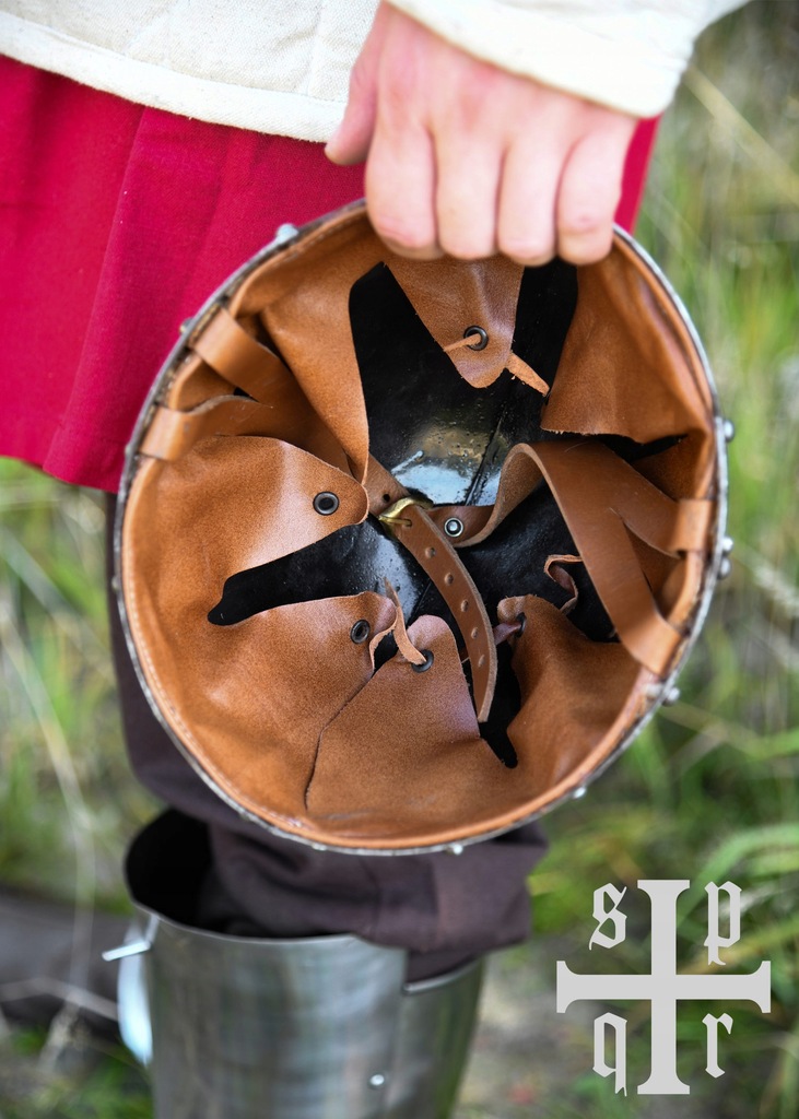 Ta replika hełmu noszonego w XIII wieku, została wykonana ze stali o grubości 2 mm. Wnętrze tego gotowego do walki hełmu jest poczernione dla lepszej odporności na korozję i wyposażone w skórzaną, regulowaną wyściółkę. Wytrzymały, regulowany skórzany pasek podbródkowy zamykany jest mosiężną klamrą.