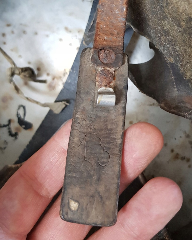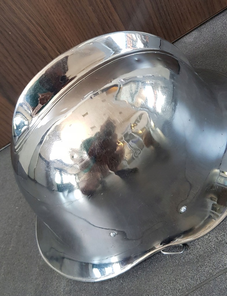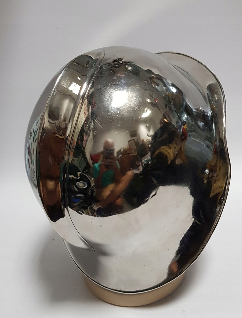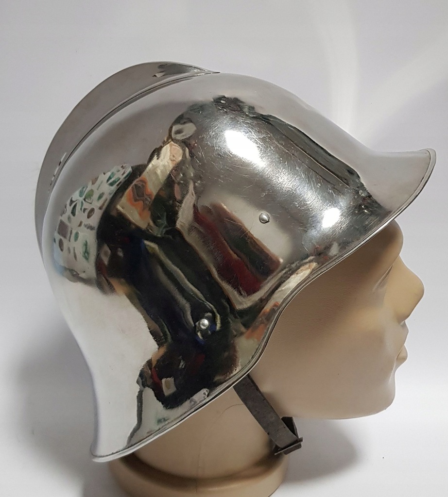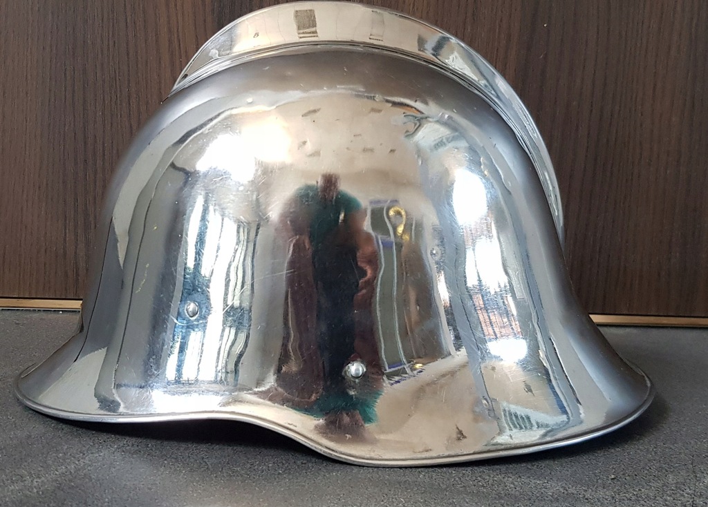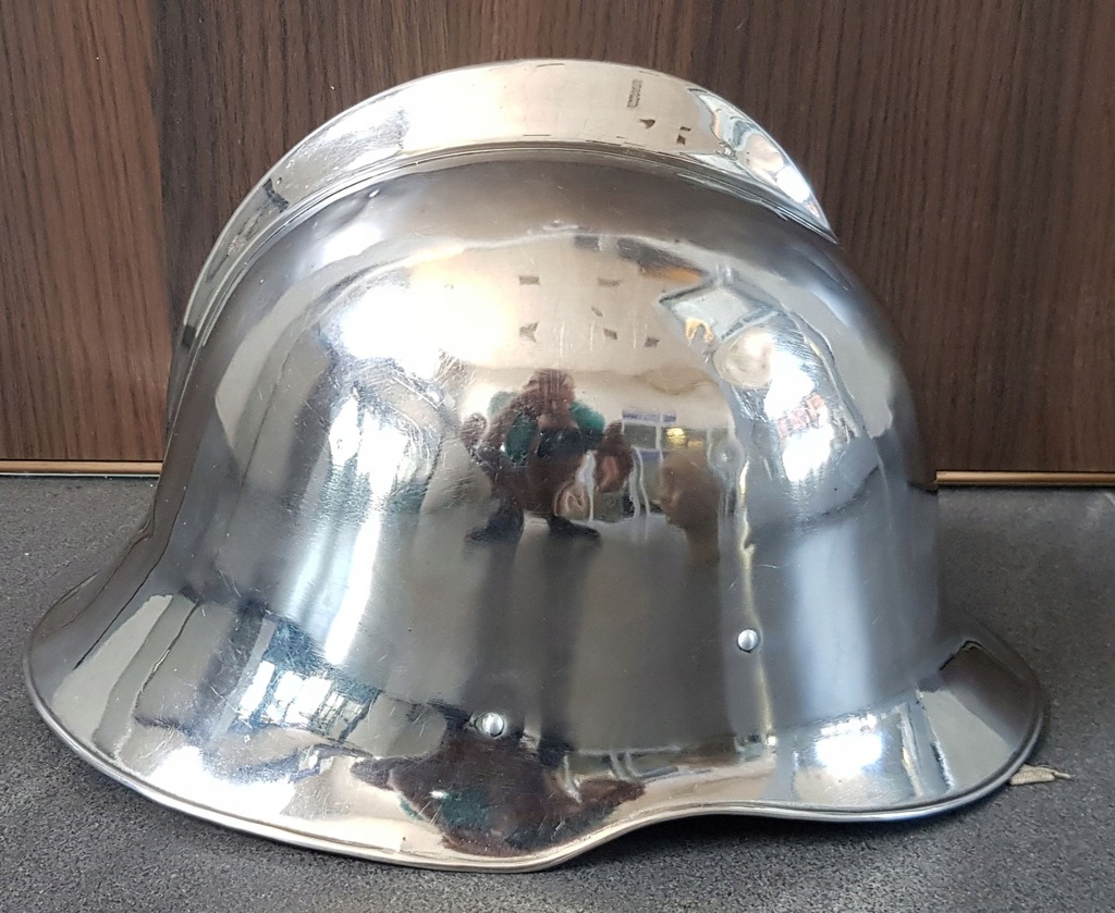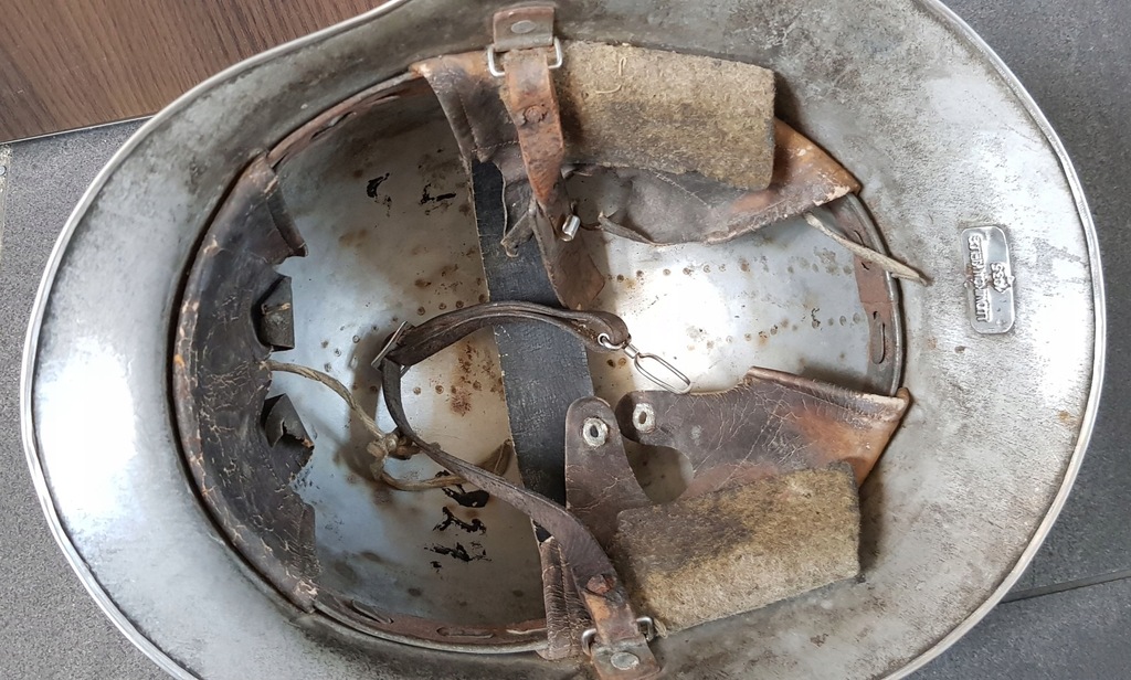 Hełm kompletny łącznie z fasunkiem. Oryginalny środek i pasek do mocowania pod brodą, widoczny numer 13 na skórze.