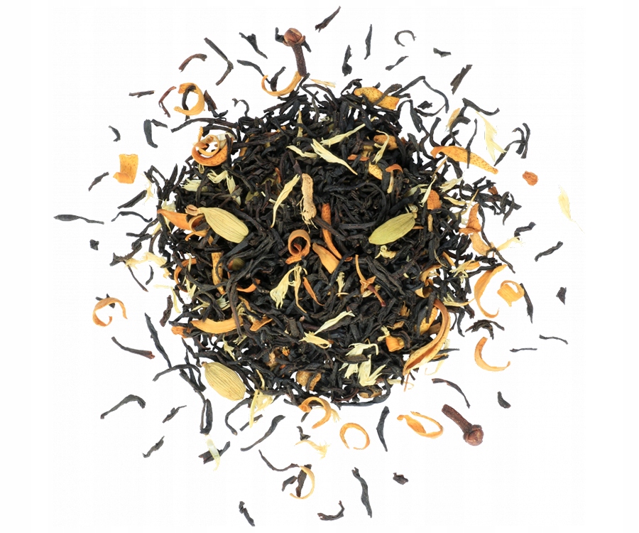 Czarna liściasta herbata cejlońska z dodatkiem chabru, kwiatów pomarańczy, cynamonu, imbiru, goździków, kardamonu, gałki muszkatołowej, pieprzu oraz naturalnym korzennym aromatem.