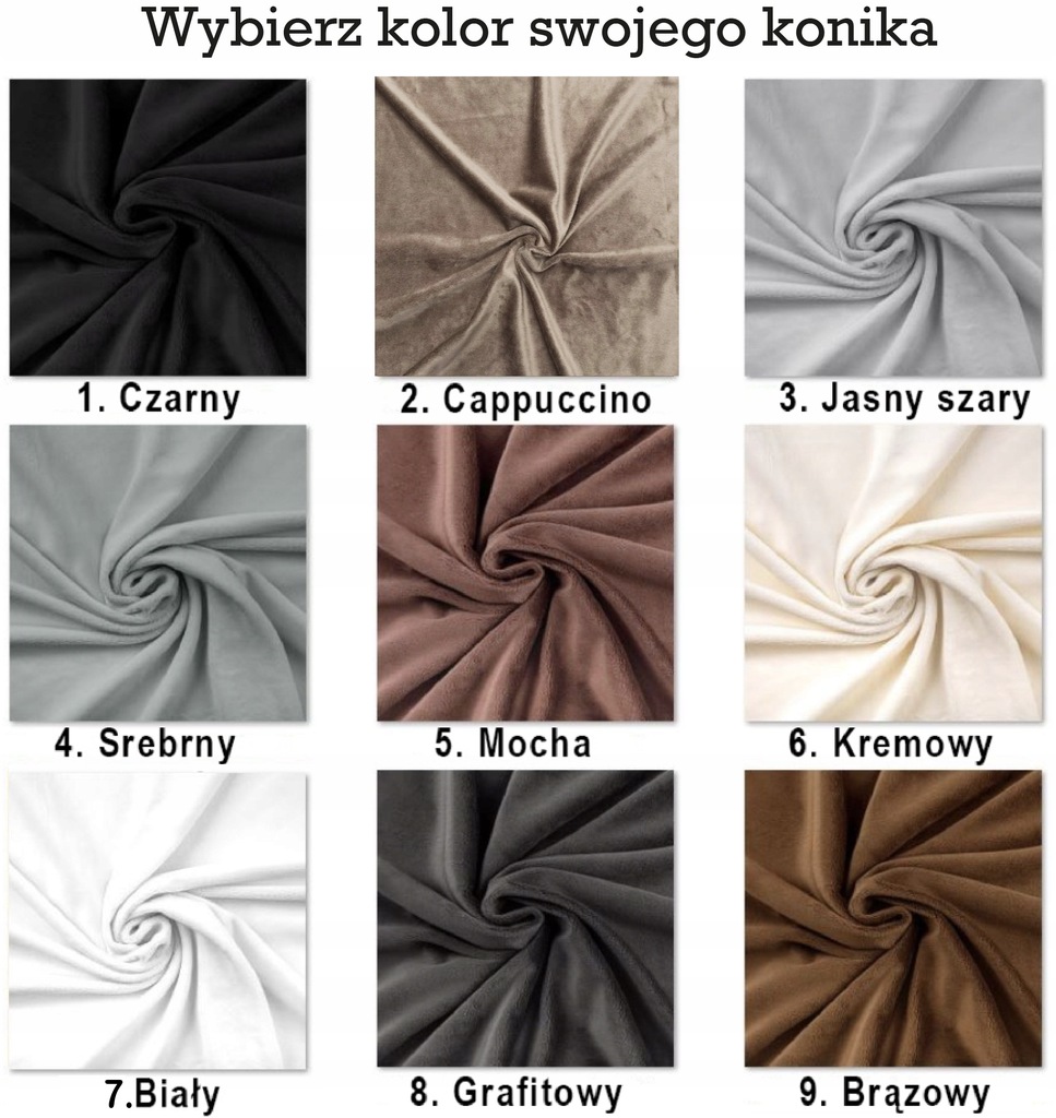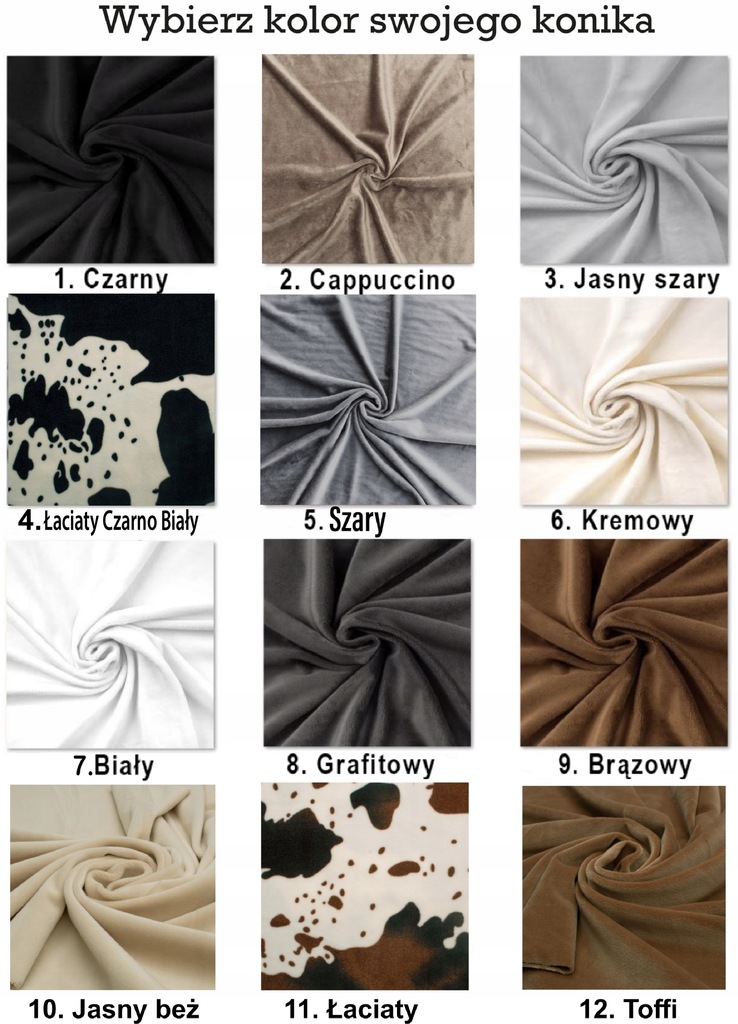 Aby jeszcze bardziej dostosować konika do Twoich marzeń, możesz wybrać spośród różnorodnej palety kolorów, które przygotowaliśmy specjalnie dla Ciebie. Czy to ma być klasyczny brąz, czy może jakiś odważniejszy kolor? Wybór należy do Ciebie, aby twój konik był jeszcze bardziej wyjątkowy!
