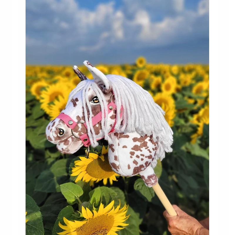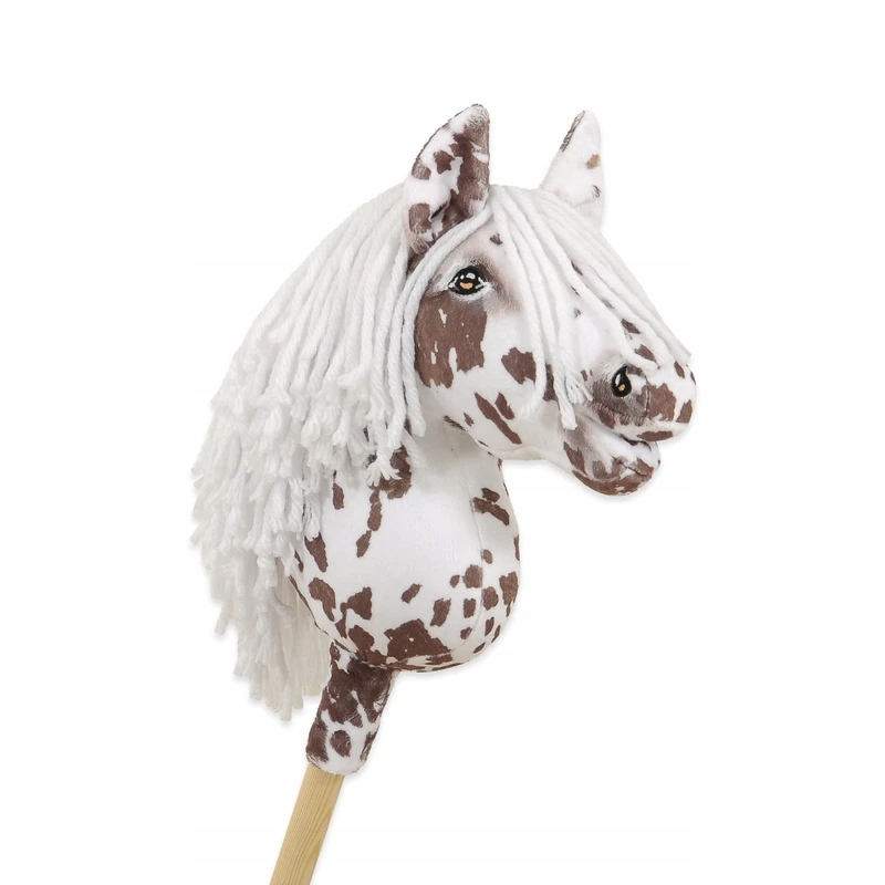 Super Hobby Horse – piękny realistyczny koń na kiju – biało-brązowy tarantowaty koń z białą grzywą