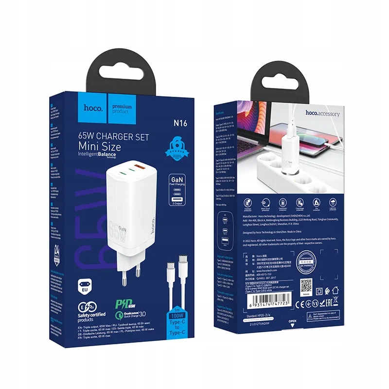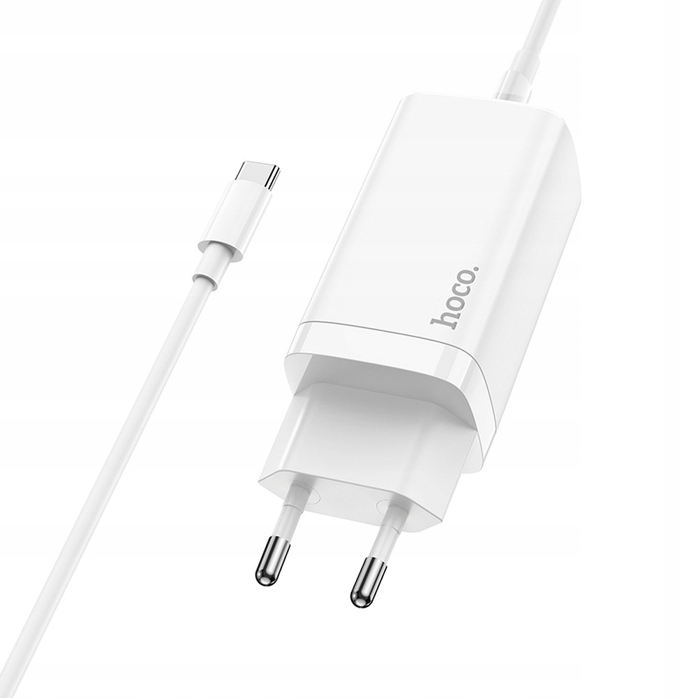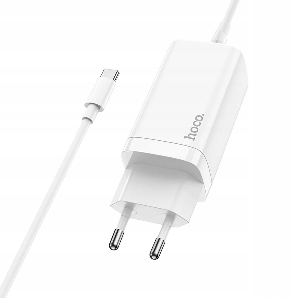 Nowoczesna ładowarka sieciowa GaN marki HOCO. Wyposażona w trzy porty: 2x typu C, USB, umożliwia ładowanie do trzech urządzeń jednocześnie. W zestawie z kablem typu C o mocy 100W, który może ładować laptopy o dużej mocy. Wspiera protokoły szybkiego ładowania.