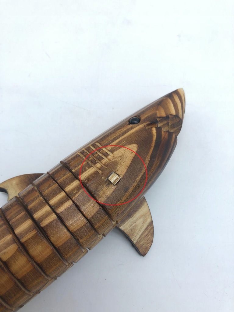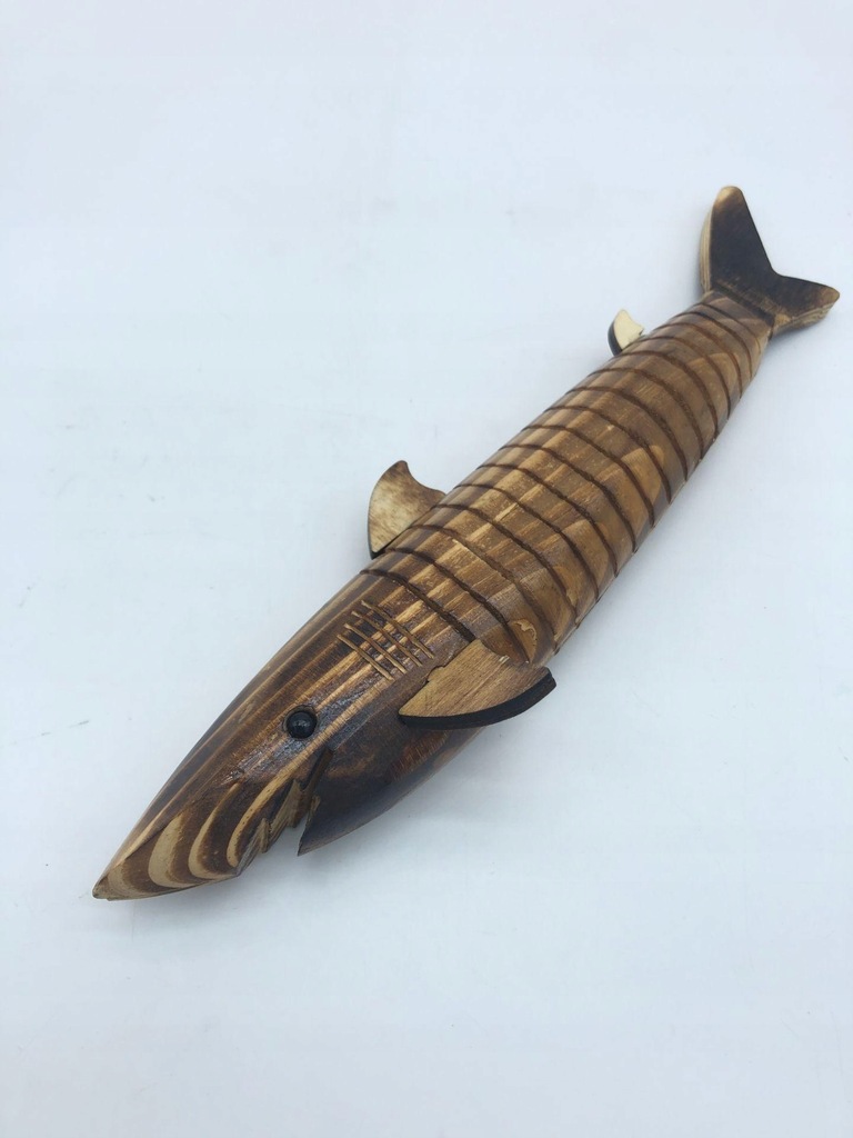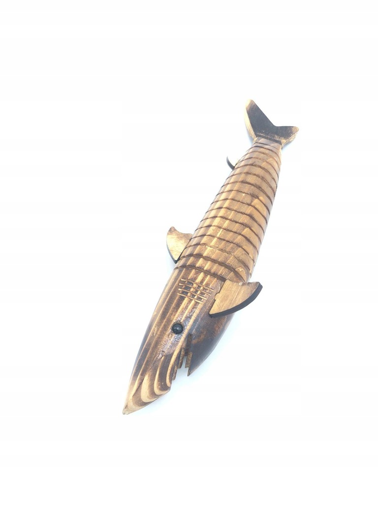 Drewniana ozdoba w kształcie zwierzątka morskiego - wykwintna i kunsztowa, zaprojektowana na wzór rekina, dodaje odrobinę natury.