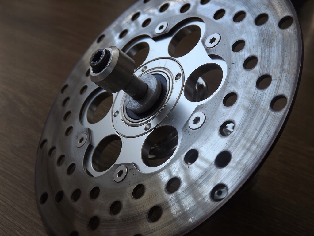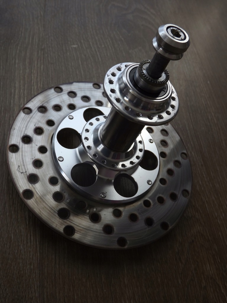Model Ti-Glide Front Hub wraz z zaciskiem i tarczą hamulcową.