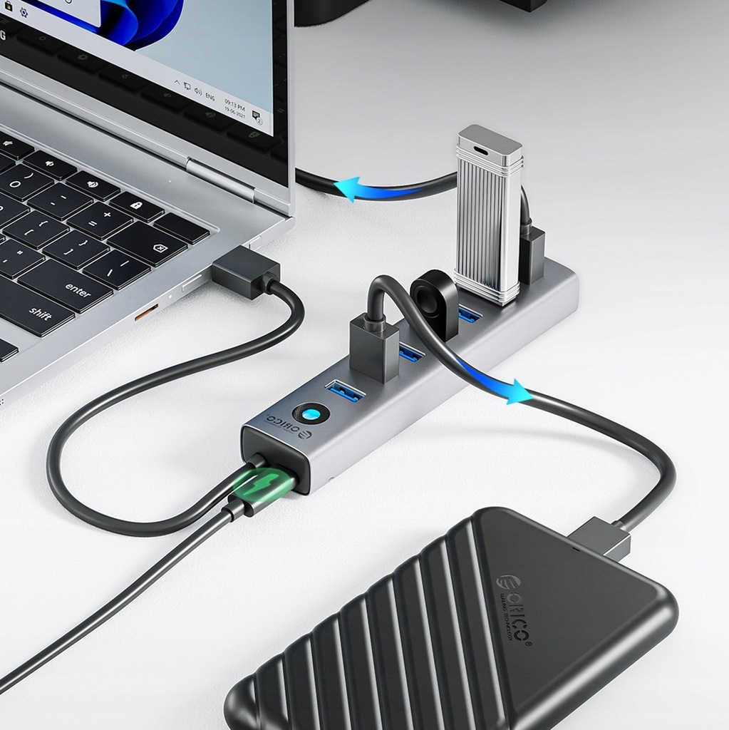 Hub Orico CL7U-U3 zapewnia 7 portów USB 3.0, dzięki czemu możesz podłączyć klawiaturę, mysz, pendrive, drukarkę czy dyski zewnętrzne - wszystko w jednym miejscu.