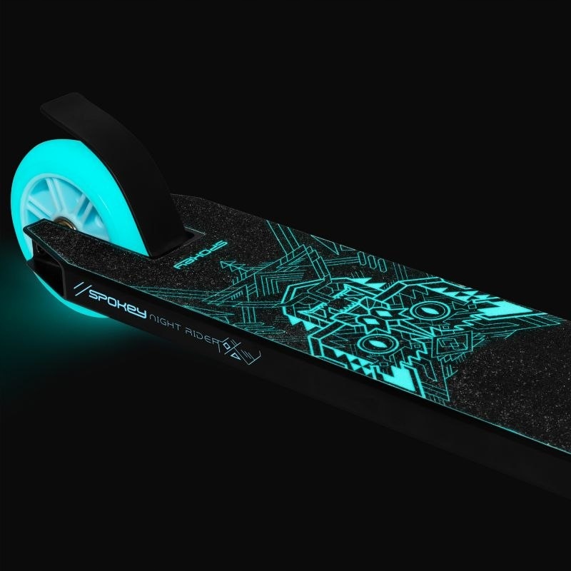 Hulajnoga wyczynowa Night Rider to idealny wybór dla początkujących i średnio zaawansowanych skaterów. Cechuje się wzmocnioną konstrukcję a jednocześnie lekką wagą. Antypoślizgowy deck z fosforyzującą powłoką świecącą w ciemności, zapewniając nie tylko styl, ale i lepszą widoczność podczas jazdy.