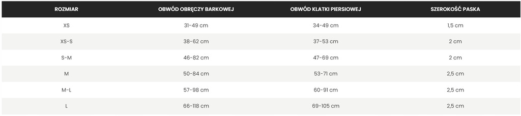 rozmiar M: Obręcz barkowa: 50-84 cm, Obręcz klatki piersiowej: 53-71 cm, Szerokość paska 2,5 cm