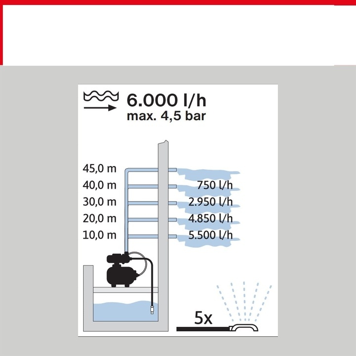 - Maks. wydajność tłoczenia: 6000 l na h. Maks. wysokość tłoczenia: 45 m na Maks. ciśnienie 4,5 bar na moc znamionowa 1500 W na przyłącze ciśnieniowe 30,93 mm (1" gwint wewn.) na przyłącze ssące 39,59 mm (1 ¼" gwint wewn.) na zbiornik ciśnieniowy 22 l na stal