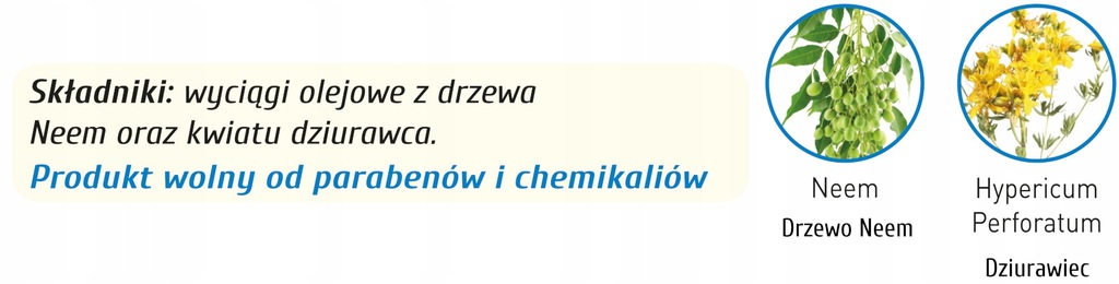 - Składniki: wyciągi olejowe z drzewa Neem i kwiatu dziurawca