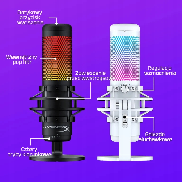 HyperX QuadCast S. Model: Mikrofon do komputera, Czułość mikrofonu: -36 dB, Całkowite zniekształcenie harmoniczne mikrofonu: 0,05%. Technologia łączności: Przewodowa, Interfejs urządzenia: USB, Obsługiwany typ USB: USB Type-C. Kolor produktu: Biały, Długość kabla: 3 m. Źródło zasilania: USB. Waga mikrofonu: 255 g