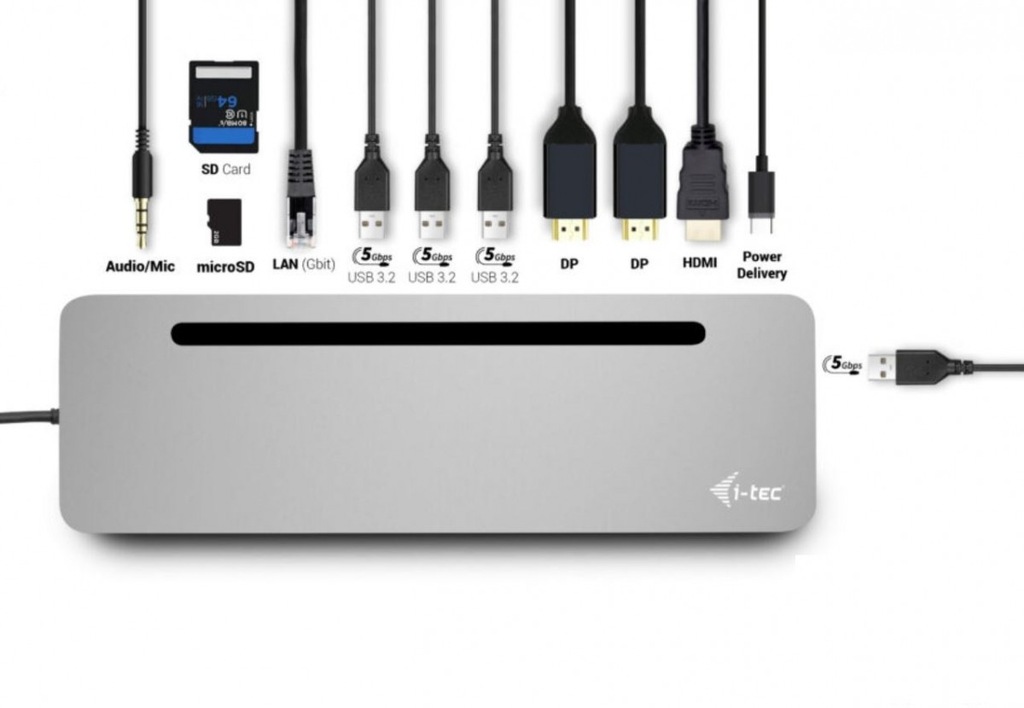 - Ergonomiczna konstrukcja z aluminiową obudową, stacja dokująca posiada zintegrowany kabel USB-C o długości 60 cm, dzięki czemu nadaje się do użytku ze wszystkimi laptopami i tabletami z wyświetlaczami do 15" włącznie.