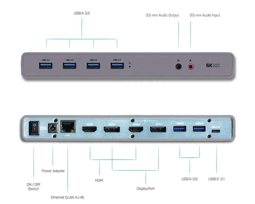 Rozszerz możliwości swojego notebooka, tabletu lub smartfona używając połączenia USB-C lub USB-A. Stacja dokująca USB-C Dual Display kompatybilna z Thunderbolt 3, wyposażona jest w najnowszy chipset DisplayLink DL9650 i oferuje możliwość podłączania hosta zarówno poprzez interfejs USB-C jak i interfejs USB-A (kable w zestawie). Urządzenie jest wyposażone w cztery wyjścia graficzne, 2x HDMI i 2x DisplayPort, przy czym w jednym czasie maksymalnie dwa monitory mogą być obsługiwane. Podłącz dwa monitory jednocześnie i korzystaj z wyższej rozdzielczości 4096 x 2160 przy częstotliwości 60 Hz używając dowolnej konfiguracji interfejsu (DP + DP, DP + HDMI, HDMI + HDMI). Rozdzielczość 5K (5120 x 2880 @ 60 Hz) jest obsługiwana, gdy jeden monitor jest podłączony za pośrednictwem dwóch kabli DisplayPort. 6x portów USB-A 3.0 (zgodnych z USB 3.0/2.0) umożliwiają łatwe podłączenie wszystkich istniejących urządzeń, a port RJ45 Gigabit Ethernet zapewnia niezawodne i szybkie łącze internetowe, obsługujące prędkości 10/100/1000 Mb/s. Na panelu przednim znajdują się gniazda audio 3,5 mm Jack, natomiast na tylnym panelu znajduje się łatwo dostępny włącznik/wyłącznik zasilania. Dodanie gniazda blokady Kensington zapewnia dodatkowe bezpieczeństwo, szczególnie dla osób pracujących regularnie w miejscach publicznych. Stacje dokujące i-tec są kompatybilne z większością marek i platform notebooków, dzięki czemu łatwiej niż kiedykolwiek łączysz swój ulubiony sprzęt. Urządzenie jest niezwykle kompaktowe, idealne do użytku w domu lub biurze. Ze względu na hybrydowy interfejs to jest możliwość podłączenia poprzez USB-C lub USB-A urządzenie jest idealne do pracy w tzw. systemie hot desk gorące biurko. Stacja dokująca jest odpowiednia do użytku z Macbook Pro 2016, MacBook 2015, Chromebook Pixel 2015, Acer Switch Alpha 12, Acer Switch Alpha 13, Dell XPS 13, HP Elitebook Folio G1 i ASUS UX390UAK oraz innymi urządzeniami z interfejsem USB-C.