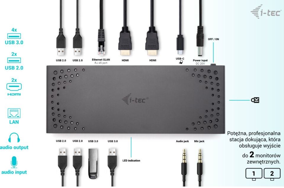 - 2x HDMI z obsługą do dwóch wyświetlaczy FHD/60Hz (w tym platformy Apple M1) lub pojedynczego wyświetlacza 1440/50Hz.