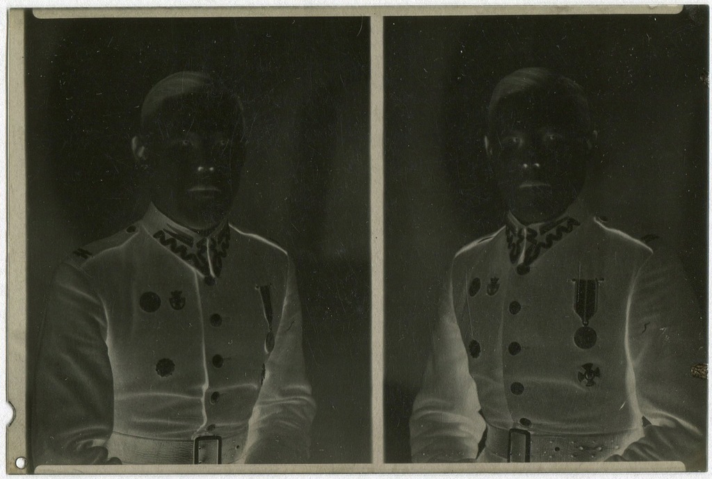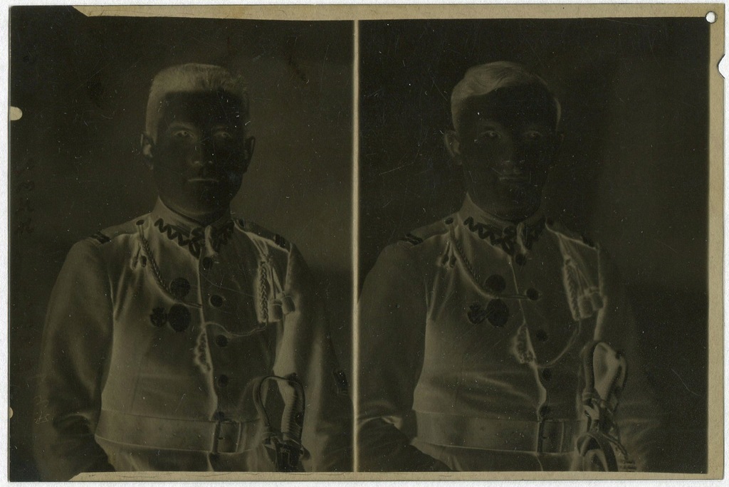 Zestaw dwóch negatywów. Widoczni są trzej podoficerowie XIV Pułku Ułanów w galowych mundurach. Na dwóch negatywach widoczna szabla paradna, prawdopodobnie Pruska. Na ramieniu dwóch podoficerów widoczne oznaczenia CKMistów oraz sznury paradne.