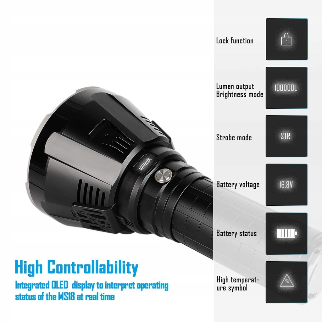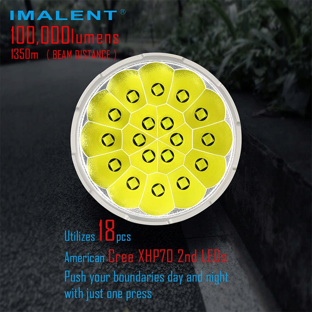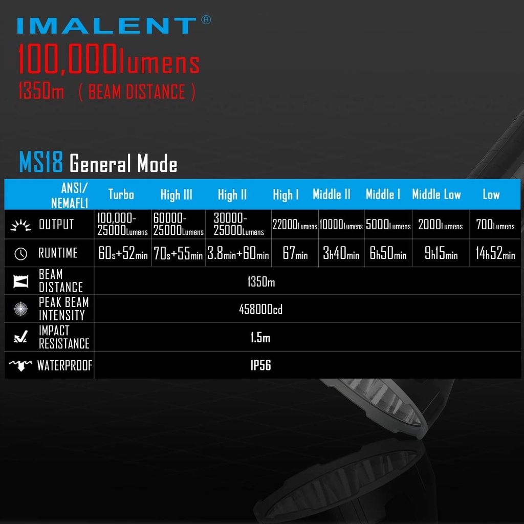 - [Wyjście Lumenowe] Imaleent MS18 działa w 9 trybach o maksymalnej mocy 100 000 Lumenów. Maksymalny zakres 1350 metrów Imalent MS18 najjaśniejsza latarka na świecie.