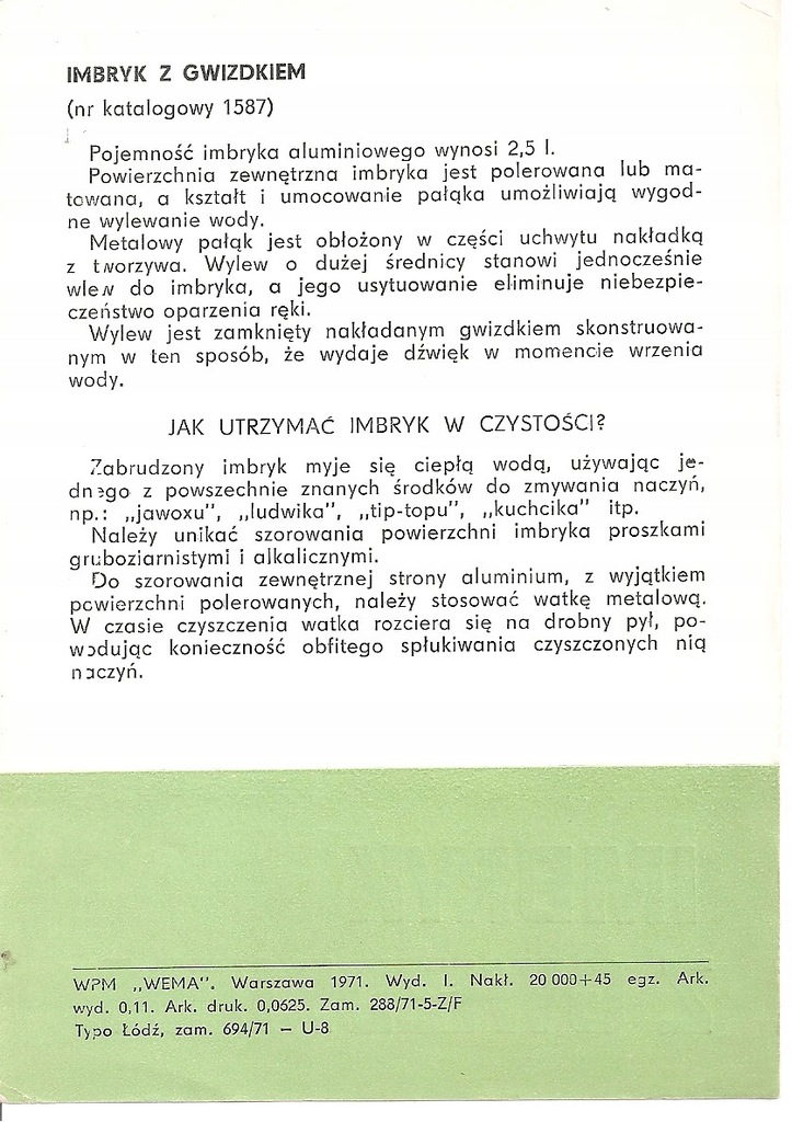 Skany przedstawiają przedmiot licytacji. Jest to instrukcja obsługi imbryka z gwizdkiem. Pochodzi najprawdopodobniej z 1971 roku. Stan ogólny dobry. Niewielkie zabrudzenia, zaplamienia i zagięcia. Wymiary 105 x 148 mm.