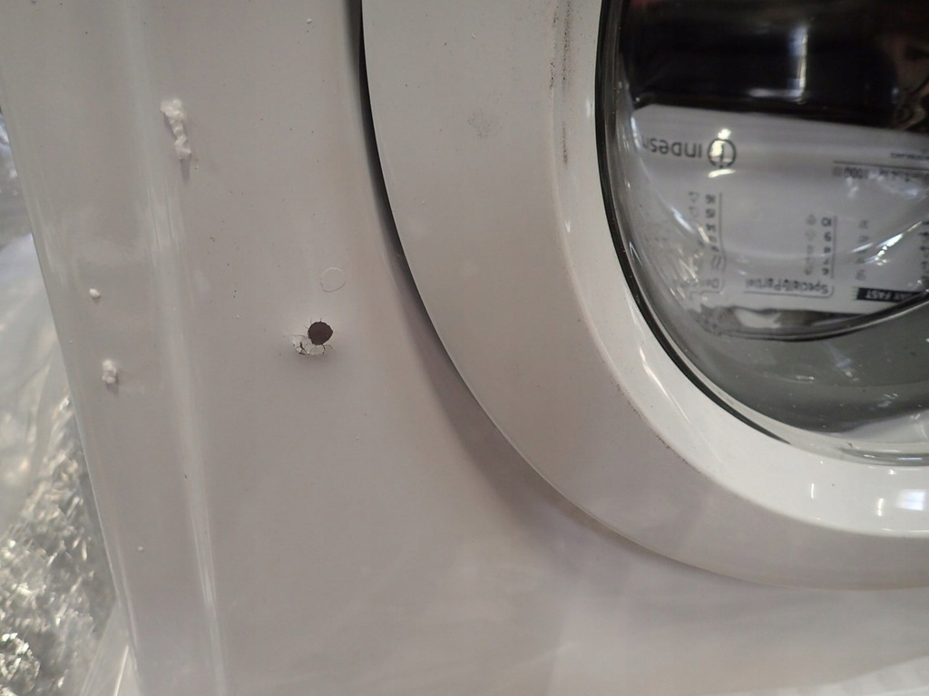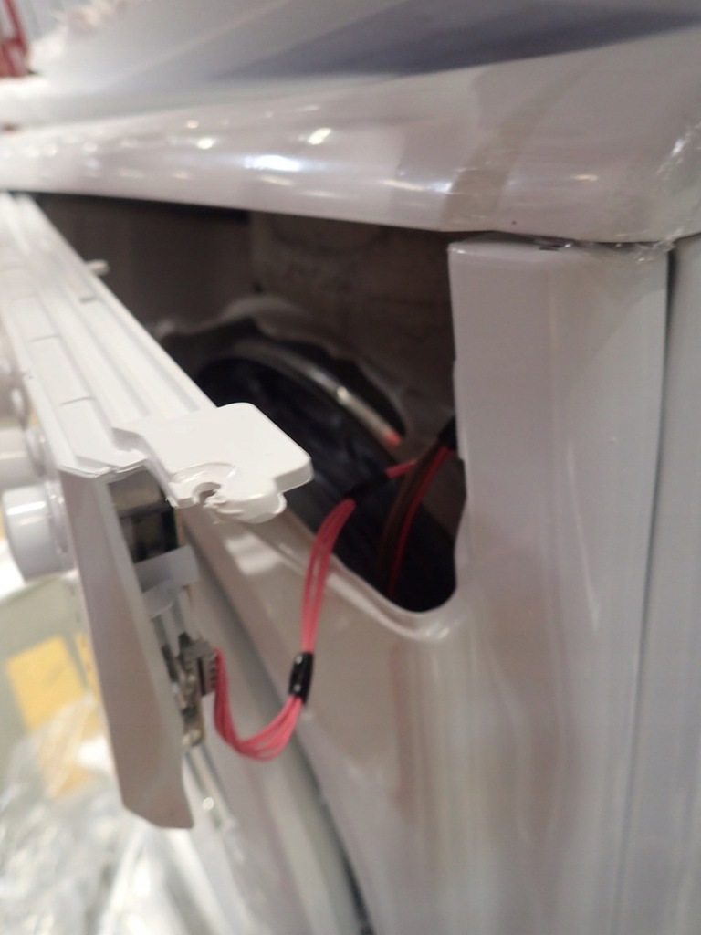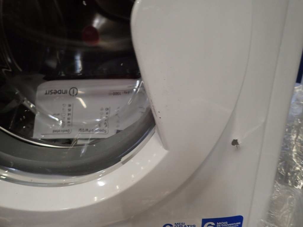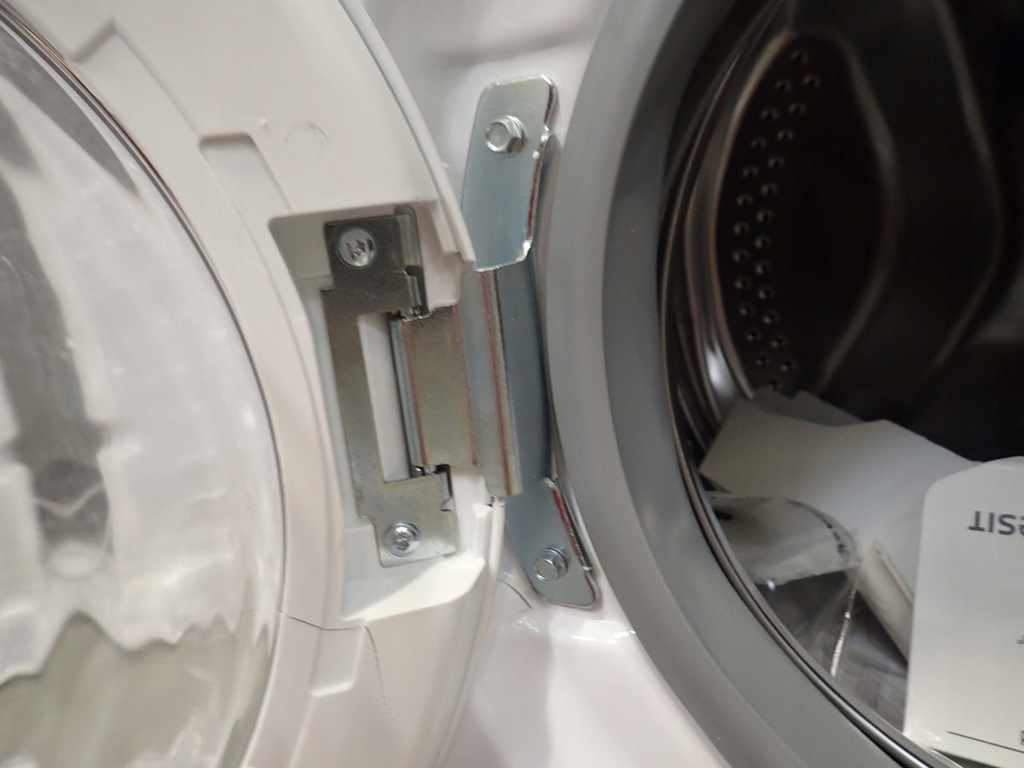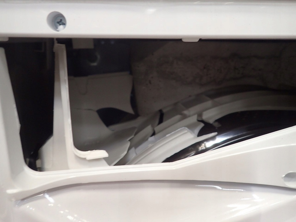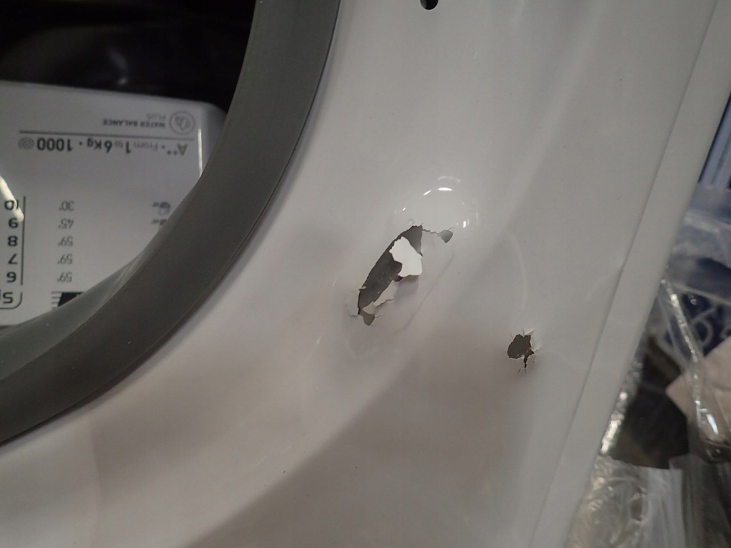 Stan produktu: Nieużywany, posiada uszkodzenie mechaniczne - pęknięty blat, pęknięta osłona bębna, liczne wgniecenia na froncie, tylnej części i bokach obudowy, wyrwany i połamany pojemnik na proszek, wyrwany blat.