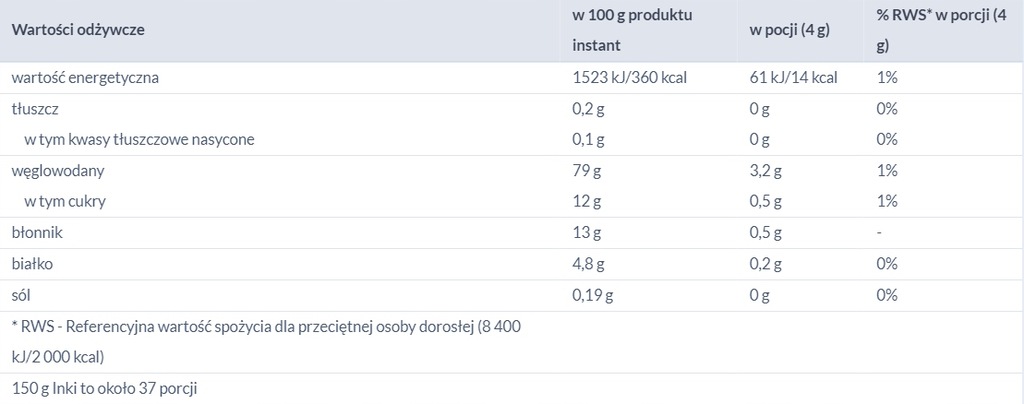 w 100 gwartość energetyczna1444 kJ/ 342 kcaltłuszcz0,2 gw tym kwasy tłuszczowe nasycone0,2 gwęglowodany73 gw tym cukry12 gbłonnik16 g