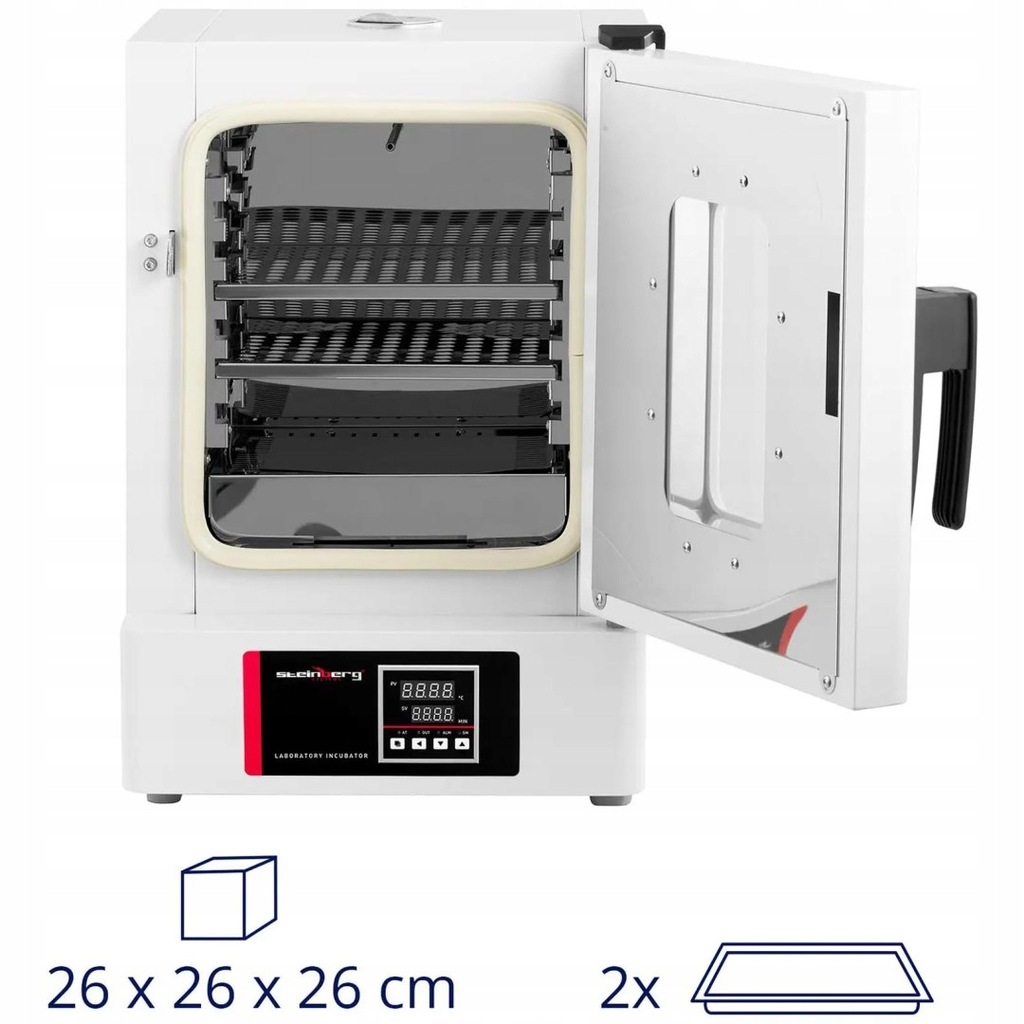 Inkubator laboratoryjny marki Steinberg Systemszapewni stałą temperaturę dla mikroorganizmów, kultur komórkowych i sadzonek. Dzięki optymalnej kontroli temperatury i solidnej obudowie jest niezawodną pomocą w każdym laboratorium w branżach farmacji, medycyny, analizy żywności czy innych badaniach. Można go łatwo i skutecznie stosować. Cieplarka laboratoryjna zapewnia optymalne warunki za pomocą sterowania PID. Można je ustawić na dotykowym panelu sterowniczym i sprawdzić na wyświetlaczu LED. Oferuje takie funkcje, jak ustawienie czasu i temperatury, zabezpieczenie przed przegrzaniem, timer i automatyczne wyłączanie. Regulator temperatury precyzyjnie utrzymuje ustawioną temperaturę w zakresie od 5 (temperatura otoczenia) do 70°C w ustawionym czasie od 0 do 9999 min. Najniższa temperatura nigdy nie spada poniżej temperatury pomieszczenia. Jest to stale sprawdzane przez czujniki i automatycznie korygowane w przypadku odchyleń. W rezultacie inkubator utrzymuje temperaturę z dokładnością do ± 2°C. Drzwi do przestronnego wnętrza są hermetycznie uszczelnione uszczelką z gumy silikonowej, co zapewnia minimalną utratę temperatury podczas inkubacji kultur lub bakterii. Okno ze szkła hartowanego jest również odporne na ciepło. Wnętrze wykonano ze stali nierdzewnej, dzięki czemu jest niezwykle łatwe w pielęgnacji i niewrażliwe na korozję lub inne wpływy otoczenia. Dzięki pojemności 18 l cieplarka jest kompaktowa i może być używana w niedużych przestrzeniach. Dzięki poziomom o regulowanej wysokości wnętrze można wykorzystać oraz dostosować do różnych próbek lub kultur. Obudowa wykonana jest z wytrzymałej walcowanej stali, która została pokryta powłoką elektrostatyczną. Dzięki temu zewnętrzna warstwa charakteryzuje się niezwykłą trwałością. Oznacza to, że inkubator laboratoryjny wytrzymuje duże obciążenia i łatwo się czyści.