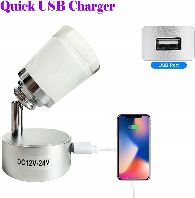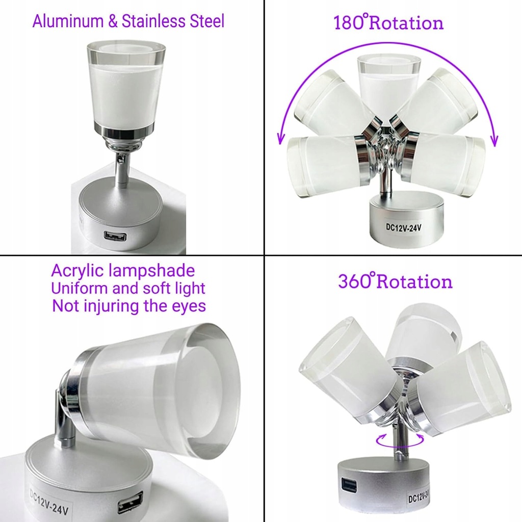 12 V lampa LED do kampera, 12 V, lampa do czytania LED, do przyczepy kempingowej, z USB, 3 W, dotykowy przełącznik ściemniania, białe, żółte i ciepłe światło, do DC12-24 V