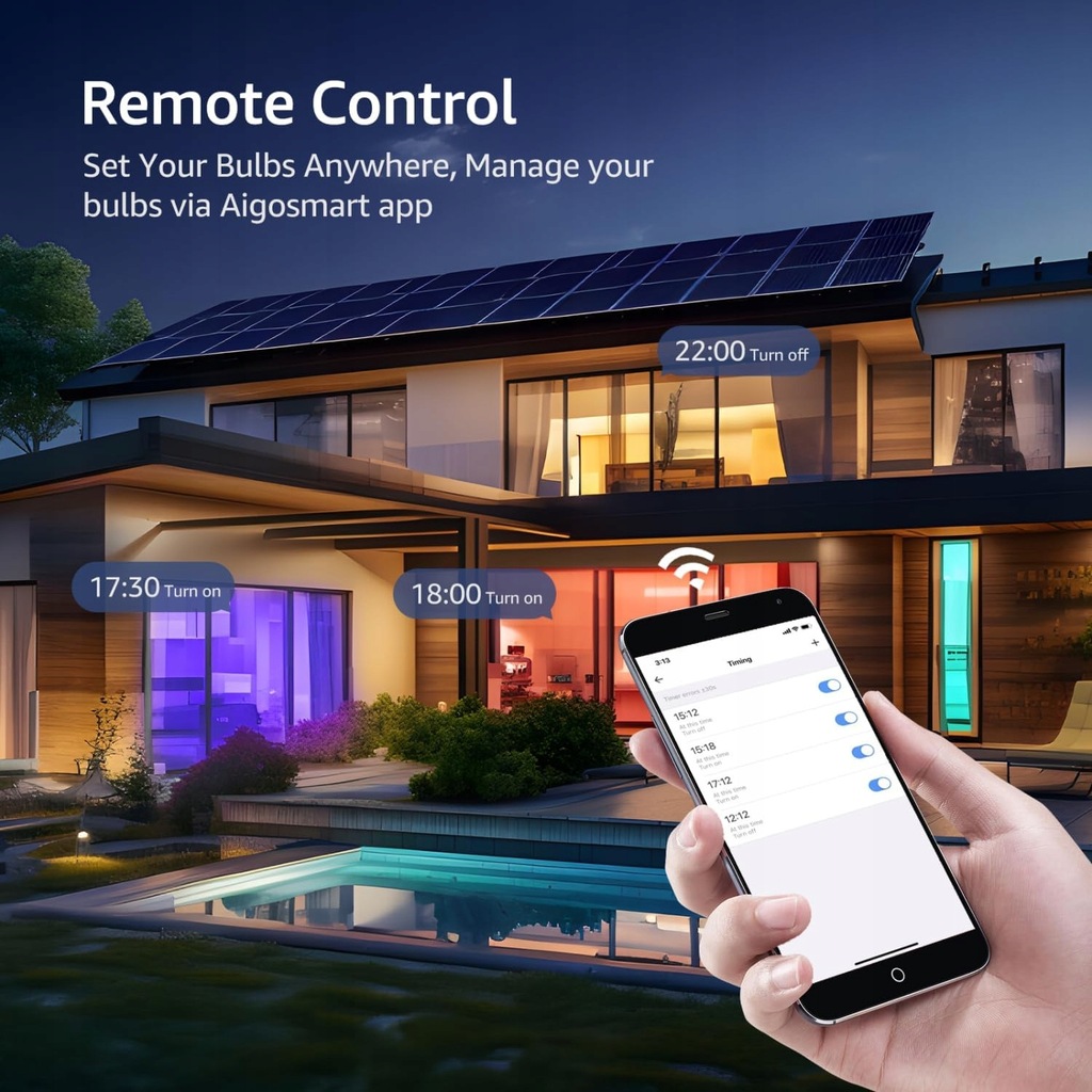 - Sterowanie głosem i zdalne: Wystarczy pobrać bezpłatną aplikację Aigosmart, podłączyć żarówki do 2,4 GHz WiFi i sterować żarówkami z dowolnego miejsca. Ta żarówka WiFi jest zgodna z Alexą i Asystentem Google, aby sterować nią za pomocą głosu. Posiada również funkcję synchronizacji z rytmami muzycznymi. (Uwaga: 5 GHz WiFi nie jest zgodne, Smart Life i Tuya również.)