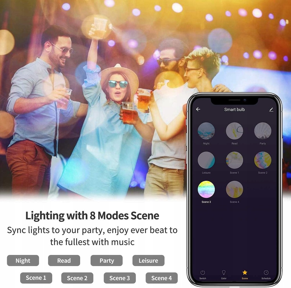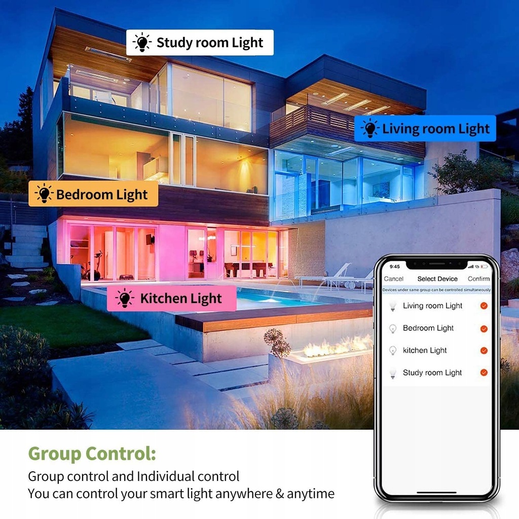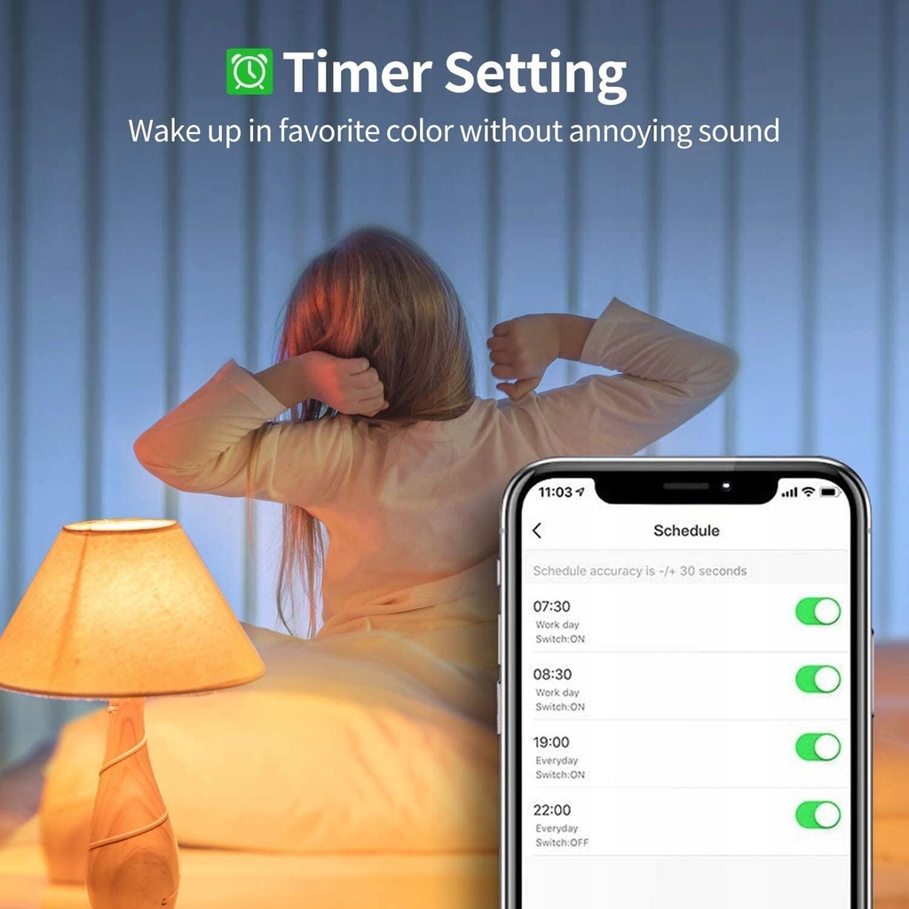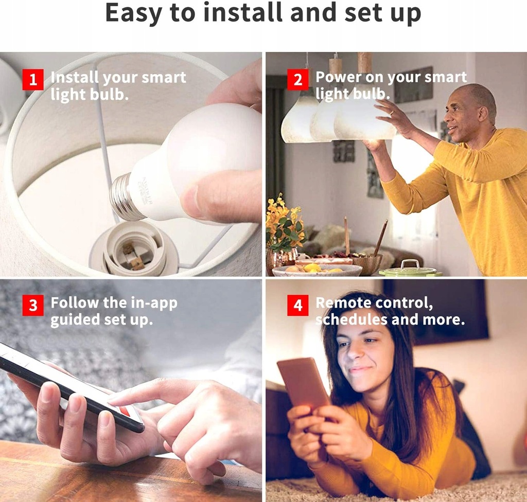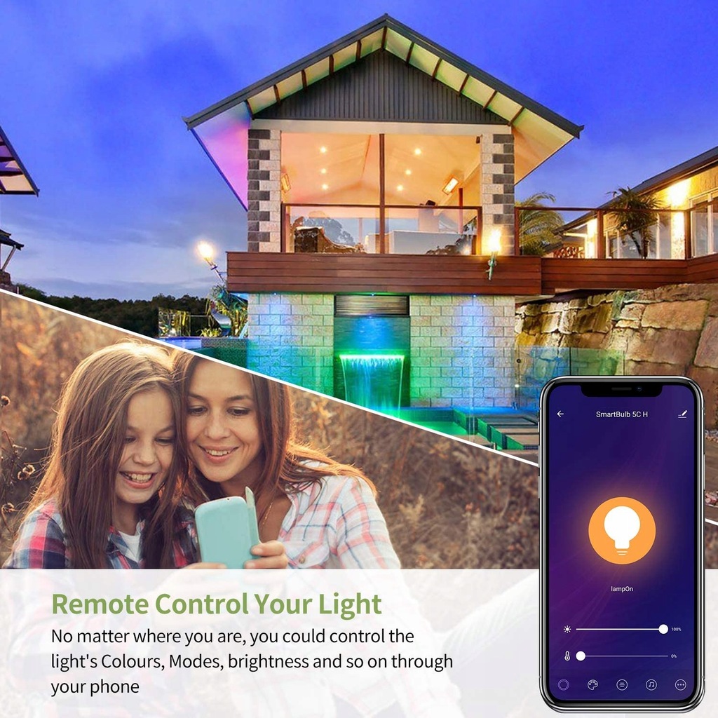 【Zdalne i grupowe sterowanie】 Utrzymuj tę inteligentną żarówkę podłączoną do domowej sieci Wifi 2,4 Ghz (obecnie nieobsługiwane 5 Ghz). Możesz zdalnie sterować tą inteligentną żarówką za pomocą smartfona, aby wyglądała, jakby w domu byli ludzie, kiedy wychodzisz z domu, za pomocą harmonogramów i timerów. Funkcje sterowania grupowego umożliwiają sterowanie więcej niż jedną inteligentną żarówką w tym samym czasie za pomocą tych samych poleceń.